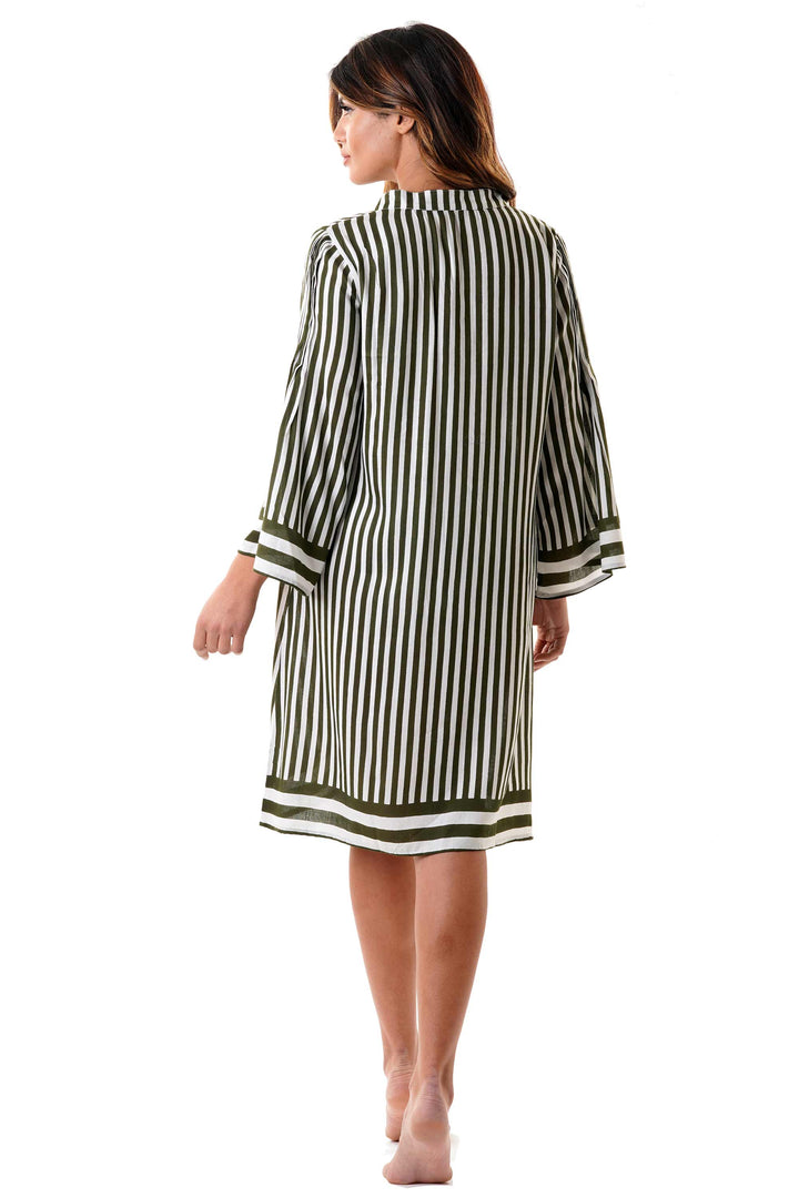 Dieses gestreifte Kleid mit Stehkragen vereint Eleganz und Komfort, ideal für diejenigen, die einen raffinierten, aber praktischen Stil suchen. Das fantasie verleiht einen modernen Touch, während der Stehkragen das Dekolleté dezent betont. Perfekt für formelle Anlässe oder einen professionellen Look, passt dieses vielseitige Kleidungsstück sich leicht verschiedenen Kontexten an und garantiert stets ein gepflegtes und anspruchsvolles Erscheinungsbild.