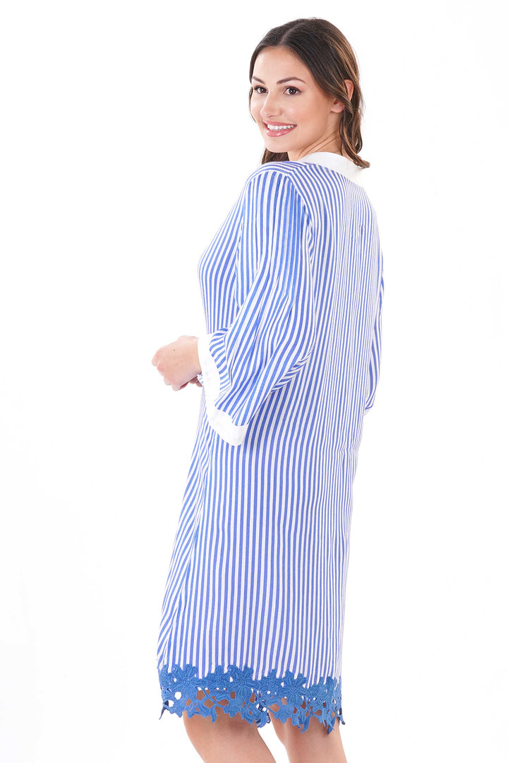 Elegantes gestreiftes Kleid mit einem raffinierten 3/4-Ärmel-Design. Die Silhouette wird durch zarte, aufgestickte Blumen am Saum und feine Spitzen-Details veredelt. Ein markantes Kleidungsstück, das die klassische Ästhetik der Streifen mit handwerklichen dekorativen Elementen der italienischen Tradition verbindet.