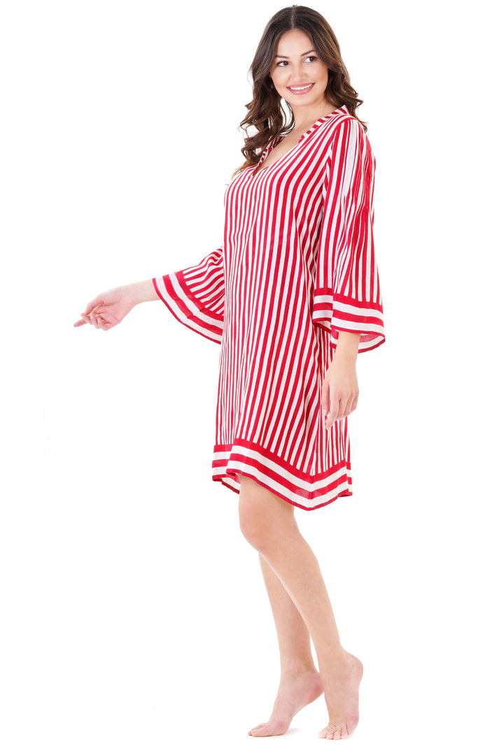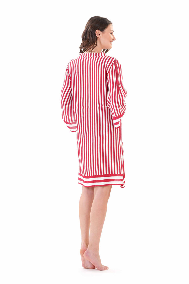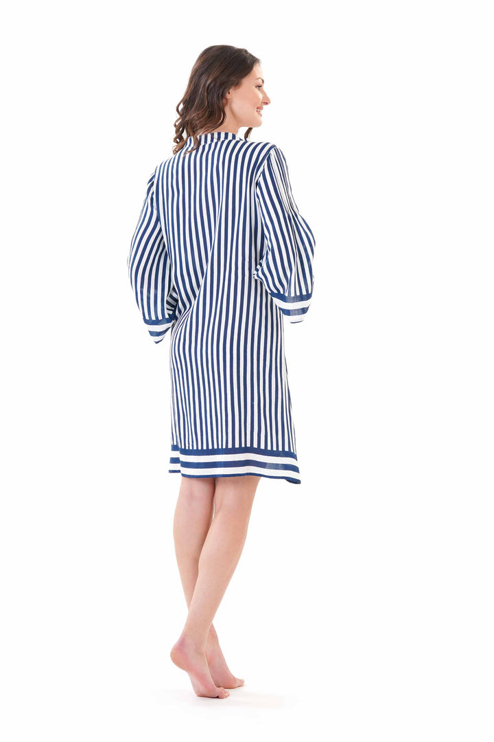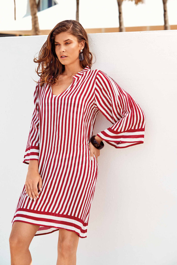 Dieses gestreifte Kleid ist perfekt für sommerliche Tage am Meer. Das klassische und vielseitige Design passt sich leicht verschiedenen Stilen an und garantiert Komfort und Eleganz. Ideal für diejenigen, die ein Kleidungsstück suchen, das Einfachheit und Raffinesse verbindet. Es stellt eine wesentliche Ergänzung der Sommerkollektion jeder Frau dar, die Qualität und mediterranen Stil schätzt.