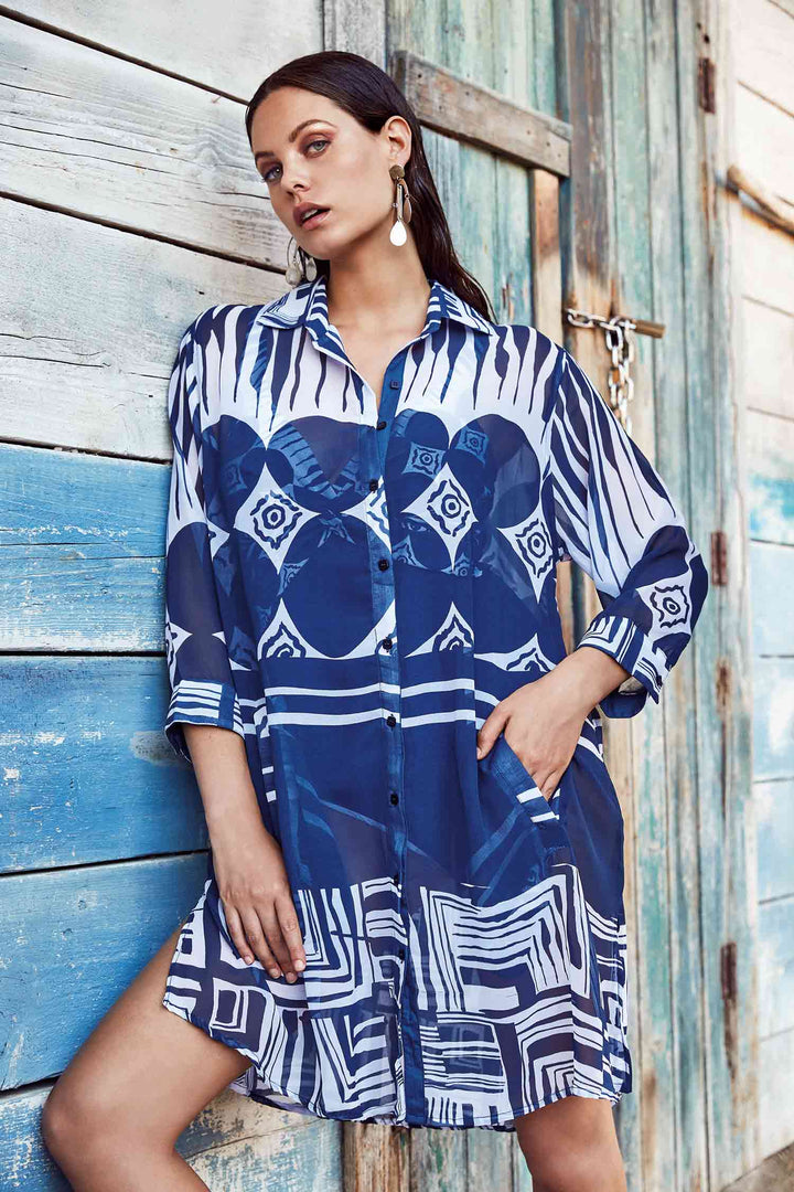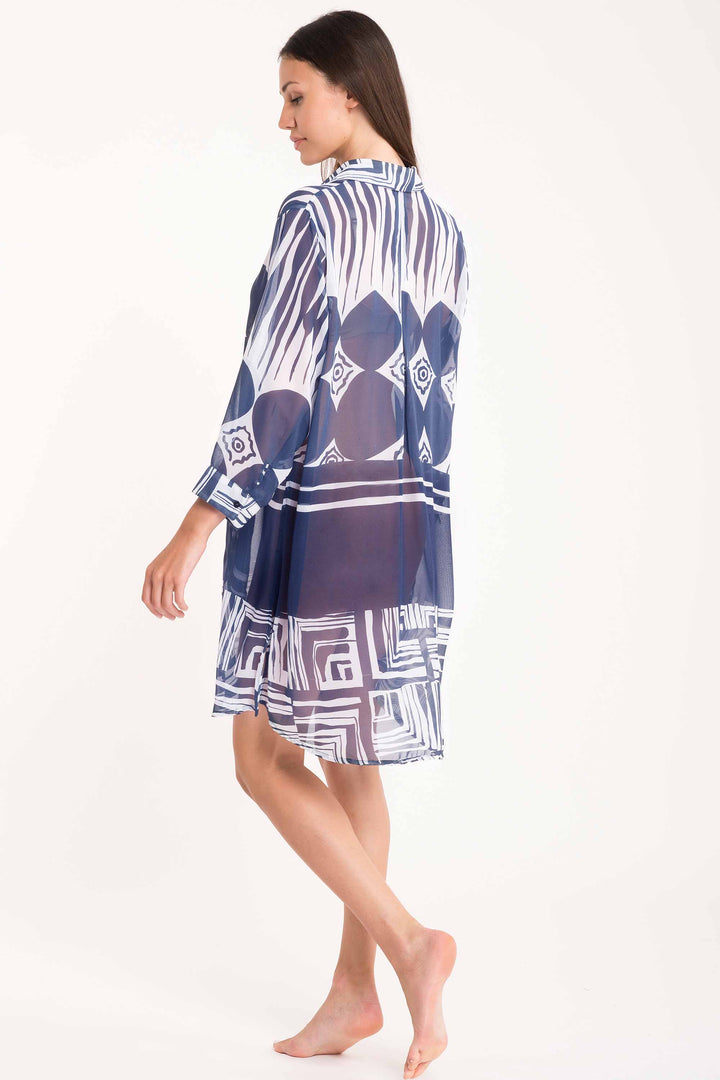 Das Hemdkleid Era mit seitlichen Taschen in blauer fantasie ist perfekt für alle, die ein vielseitiges und raffiniertes Kleidungsstück suchen. Ideal für saisonale Übergänge, verbindet es Komfort und zeitgenössisches Design mit der typischen Raffinesse unserer Sommerkollektionen.