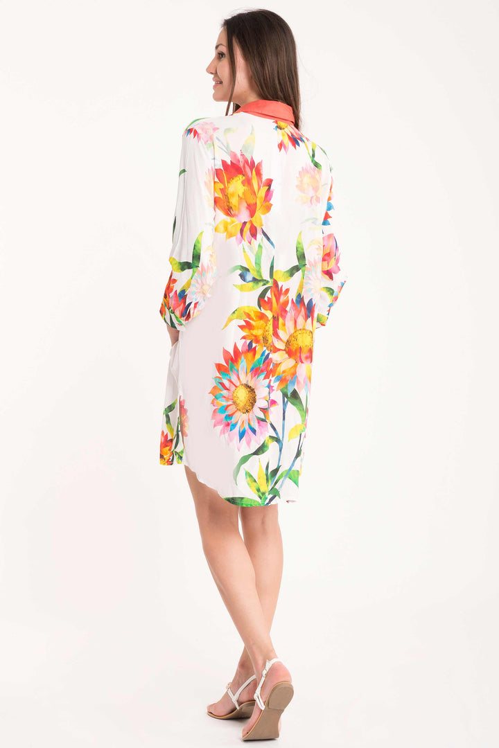 Dieses Hemdkleid mit bezaubernden fantasie floralen Mustern zeichnet sich durch eine vordere Knopfleiste aus, die vielseitige Styling-Optionen ermöglicht, sowohl komplett geschlossen getragen als auch offen als Strandkleid. Die praktischen Seitentaschen bieten Funktionalität ohne ästhetische Kompromisse. Perfekt für Sommertage am Strand oder für einen Spaziergang in der Stadt.