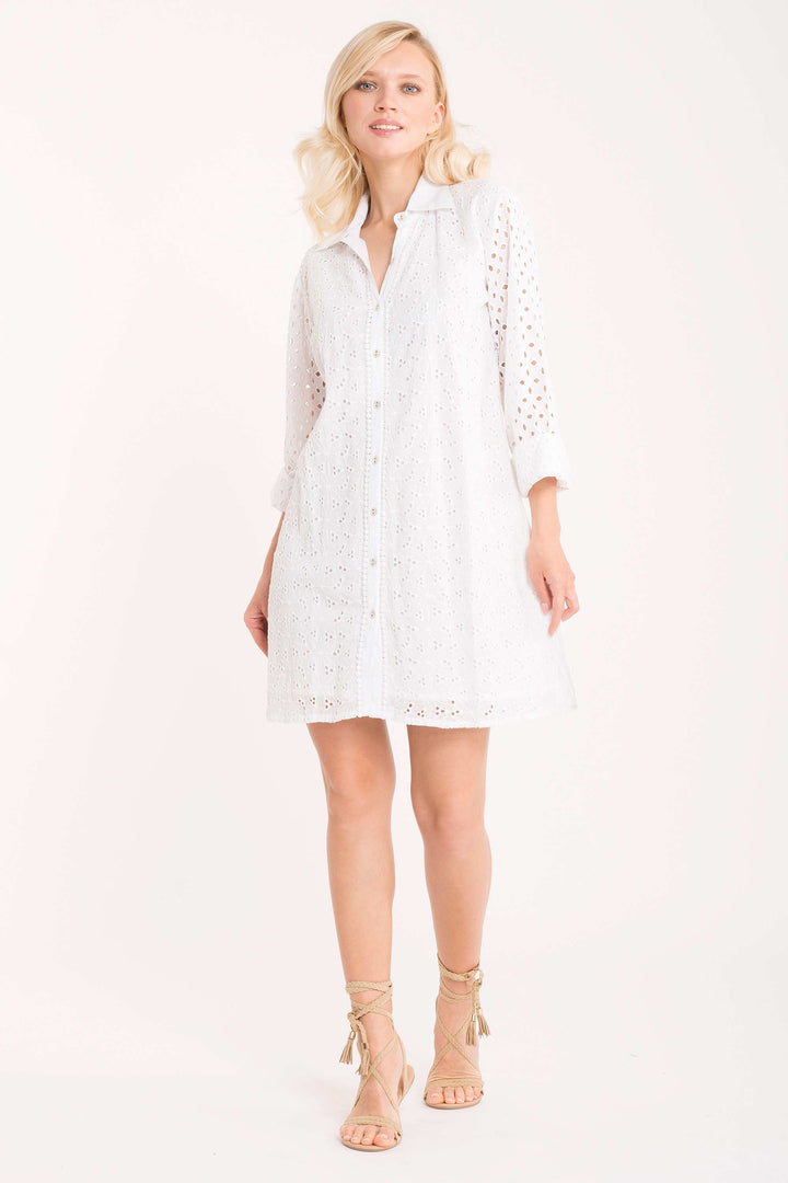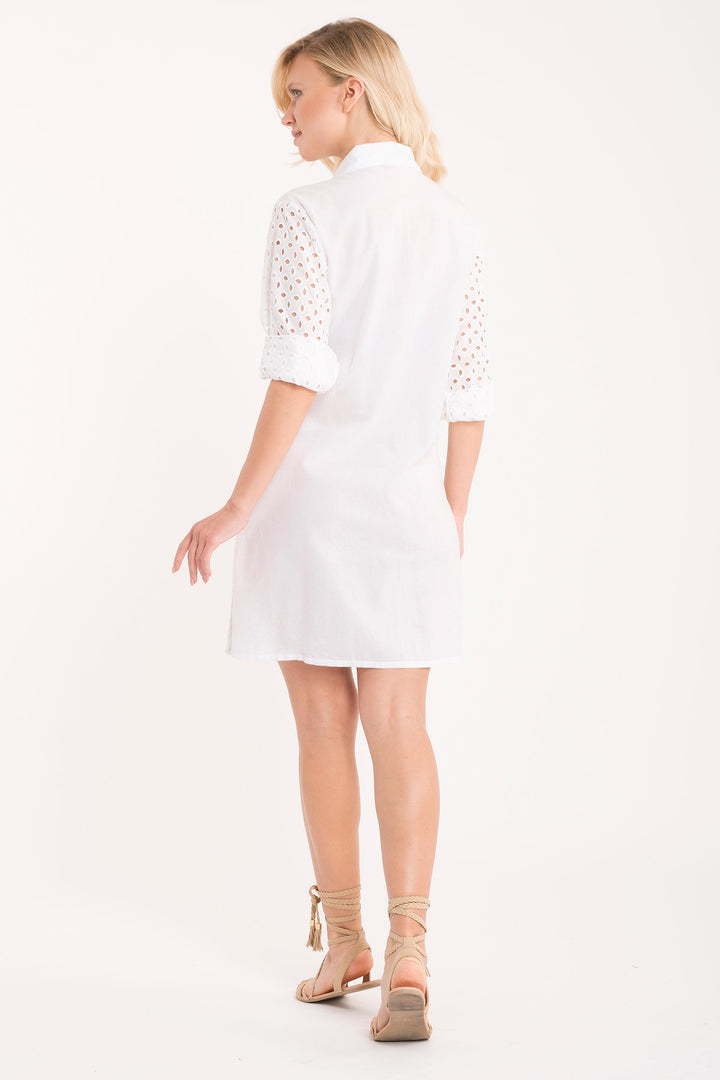 Das Hemdkleid aus reinem Baumwollstoff mit Sangallo-Spitzen-Details ist ein vielseitiges Kleidungsstück, das Eleganz und Komfort vereint. Die Hemdenstruktur garantiert eine raffinierte Silhouette, während die natürliche Baumwolle Atmungsaktivität und Weichheit auf der Haut sicherstellt. Die Sangallo-Spitze verleiht einen raffinierten Touch, perfekt für Anlässe, die eine gepflegte Ästhetik erfordern.