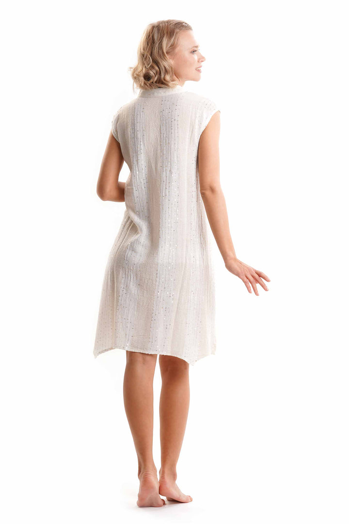 Dieses ärmellose Hemdkleid aus reiner Baumwolle ist ideal für Sommertage. Der ärmellose Schnitt garantiert maximale Bewegungsfreiheit und Atmungsaktivität, während der Stoff Komfort und Frische den ganzen Tag über sicherstellt. Eine vielseitige und raffinierte Wahl für einen essentiellen und zeitgenössischen Stil.