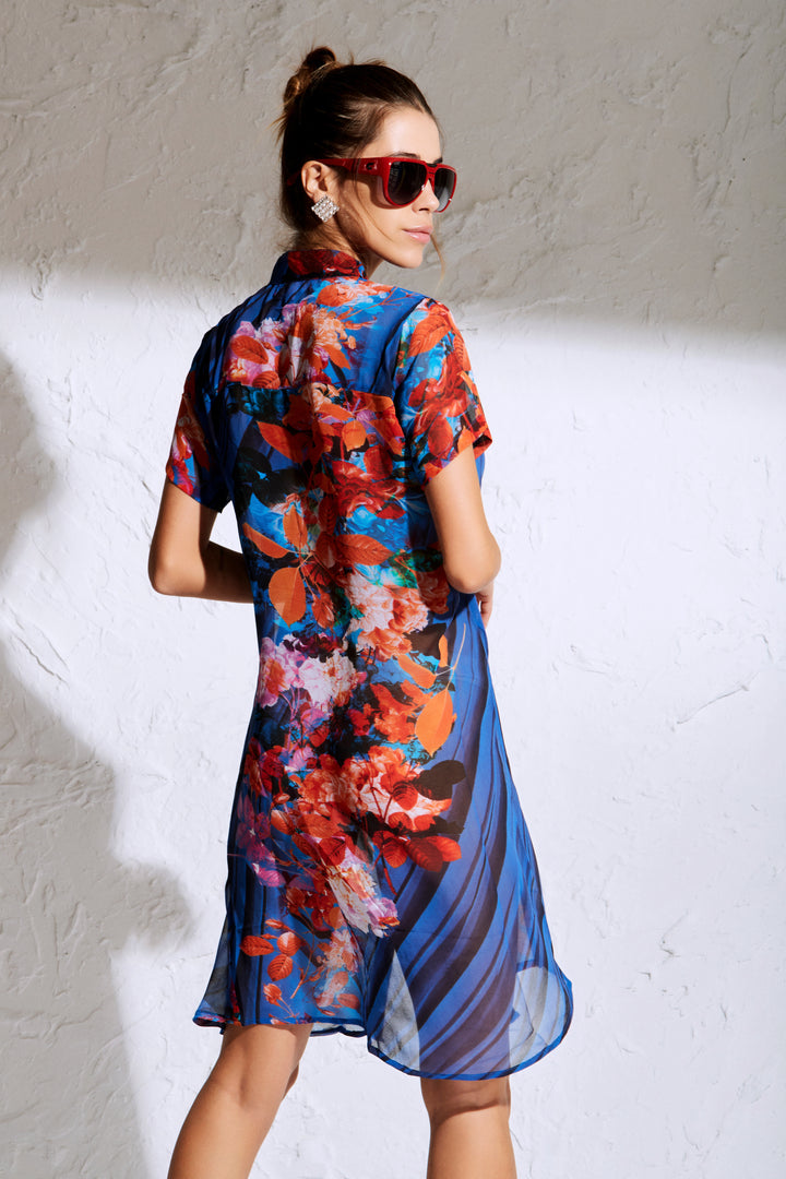 Kleid-Hemd aus transparentem Stoff mit halblangen Ärmeln und klassischem Ausschnitt, perfekt für Saisonübergänge. Die strukturierte Silhouette endet am Knie und garantiert mühelose Eleganz. Ideal für alle, die ein vielseitiges Kleidungsstück suchen, das mühelos vom Tag in den Abend übergeht und dabei eine raffinierte und zeitgemäße Ästhetik bewahrt.