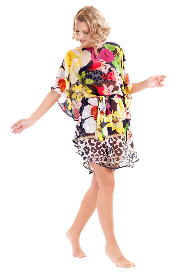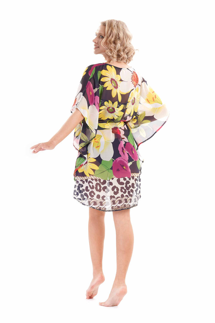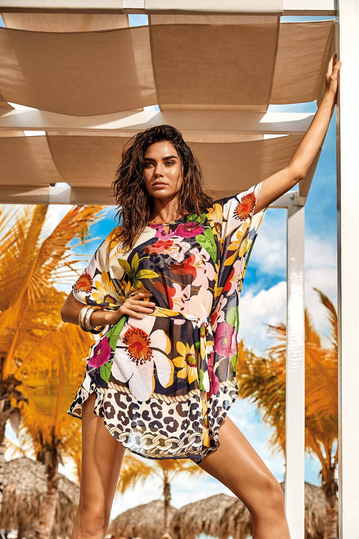 Dieses elegante Kleid mit seitlichen Schlitzen hat einen Gürtel im leben, der die Proportionen definiert und dem Design einen Hauch von Raffinesse verleiht. Die Kombination aus floralen und animalischen fantasien schafft ein mutiges und zeitgenössisches Muster, perfekt für alle, die sich stilvoll abheben möchten. Ein vielseitiges Kleidungsstück, das jede Gelegenheit in eine Möglichkeit zur persönlichen Ausdruck verwandelt.