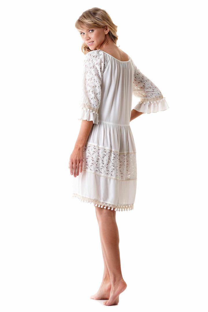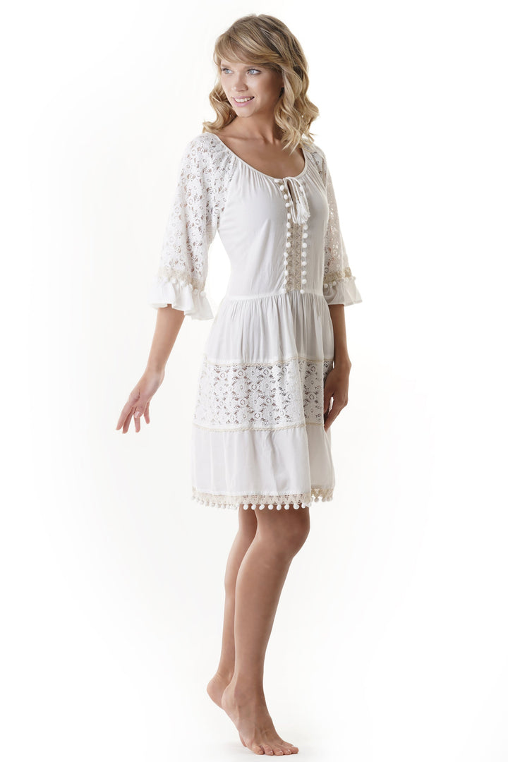 Dieses elegante Kleid verfügt über einen runden Ausschnitt mit einer dekorativen Kordel, die mit Quasten verziert ist und dem Design eine raffinierte Note verleiht. Hergestellt aus reiner Baumwolle, garantiert der Stoff Atmungsaktivität und Komfort, ideal für warmes Klima. Zarte Spitzendetails unterstreichen sein anspruchsvolles Aussehen und machen es zur perfekten Wahl für alle, die eine Verbindung von Stil und klassischer Handwerkskunst suchen.