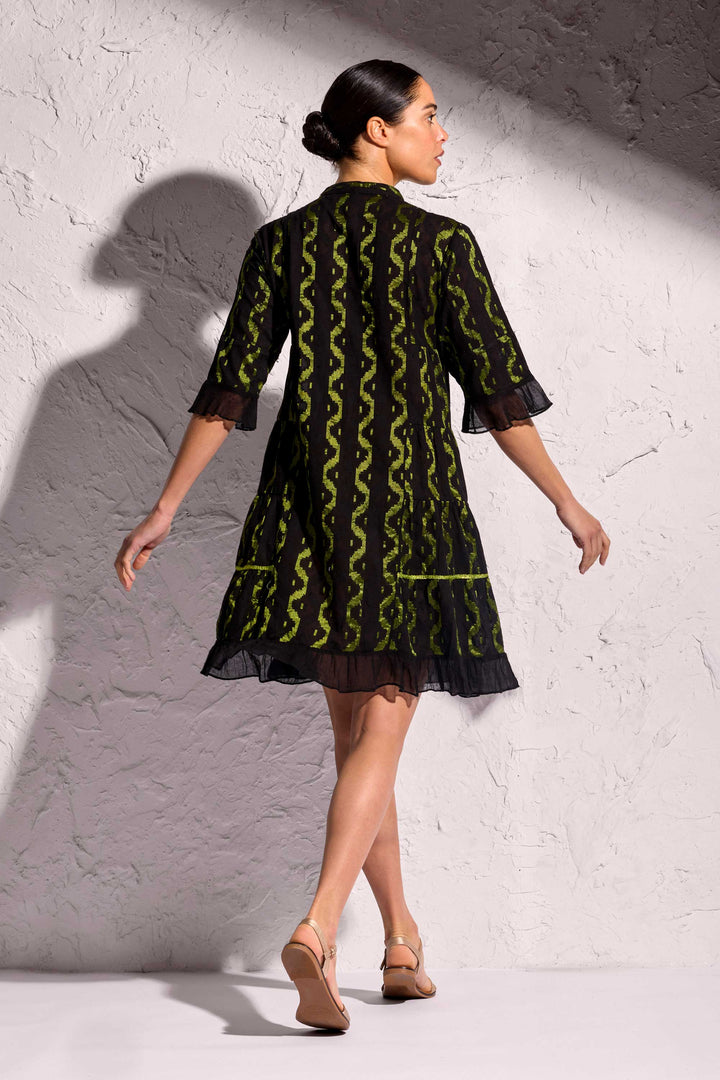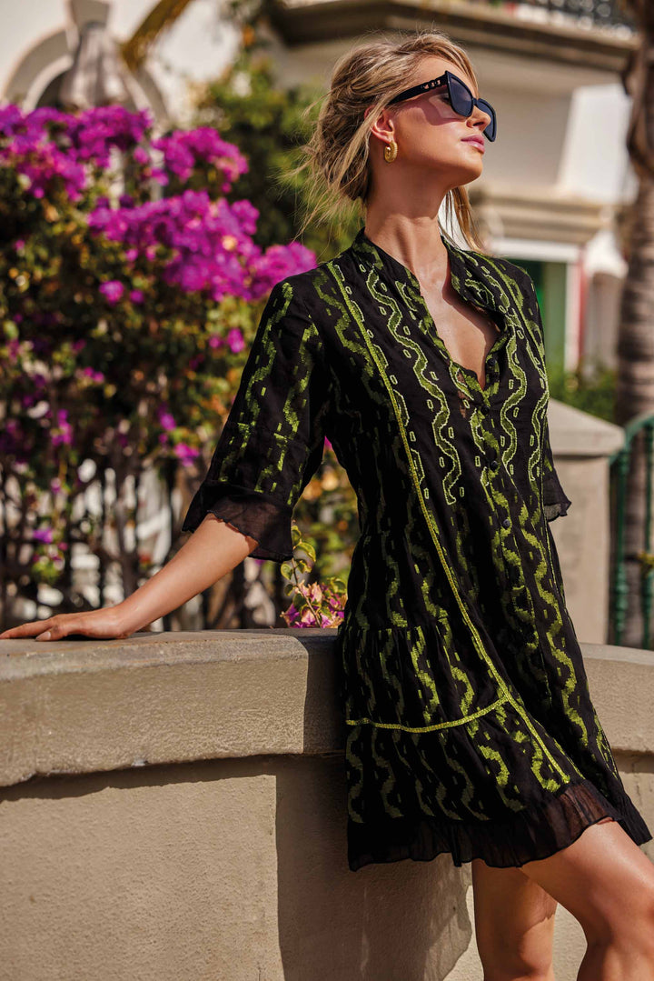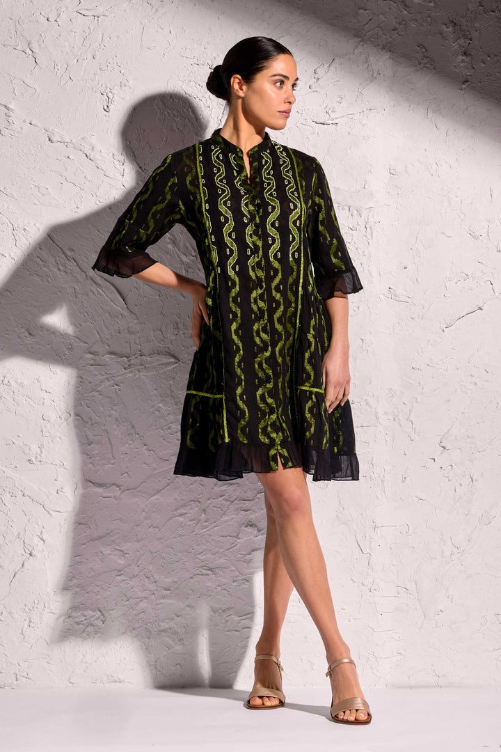 Dieses Vanessa-Kleid aus reiner Baumwolle ist perfekt für einen frischen und sommerlichen Look. Die 3/4-Ärmel und das leichte Design machen es ideal für warme Tage oder besondere Anlässe. Mit einem raffinierten mehrfarbigen Druck und Knöpfen vorne ist es das perfekte Kleid, um modisch und gleichzeitig bequem zu sein.