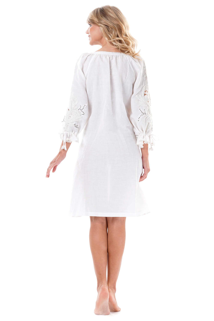Dieses Kleid, veredelt mit handwerklichen Stickereien, bietet eine raffinierte Eleganz und einzigartige Details. Der Rundhalsausschnitt sorgt für eine bequeme Passform und ein schlichtes Aussehen, während die Ärmel mit verstellbaren Schnürungen es ermöglichen, den Look und die Anpassung nach den eigenen Vorlieben zu personalisieren. Perfekt für alle, die ein handgefertigtes Qualitätsstück mit vielseitigem Stil suchen.