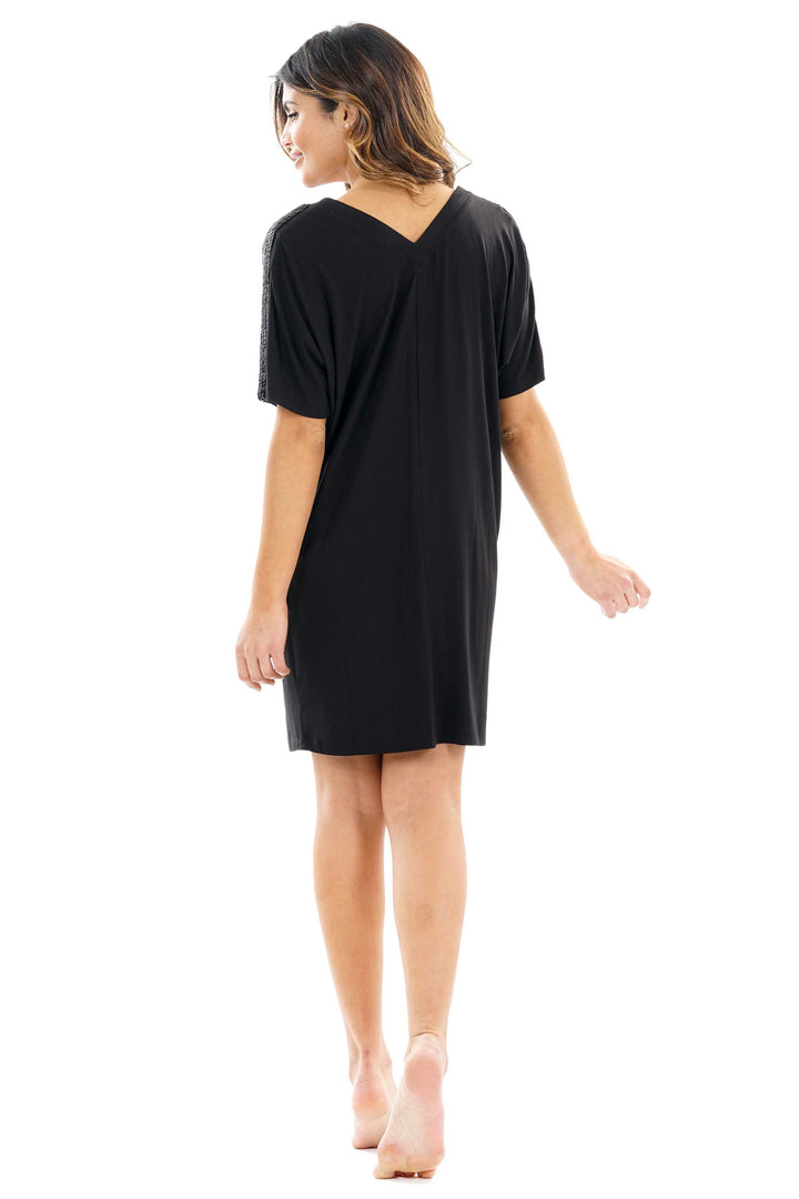 Dieses elegante Kleid verfügt über einen raffinierten V-Ausschnitt und ärmellose Ärmel, ideal, um die Silhouette mit einem Hauch von Weiblichkeit zu betonen. Perfekt für besondere Anlässe, verbindet es Komfort und Stil auf raffinierte Weise.
