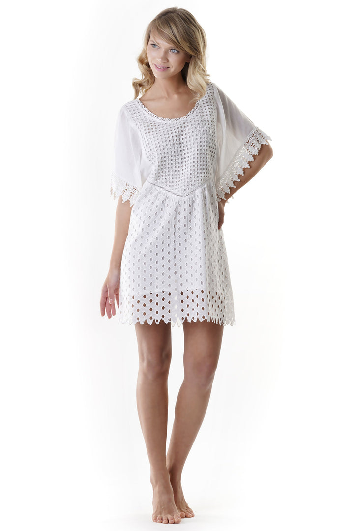 Dieses elegante Kleid verfügt über einen klassischen Rundhalsausschnitt und ist aus reiner Baumwolle gefertigt, um Atmungsaktivität und Komfort zu gewährleisten. Die exquisiten Sangallo-Spitzen-Details verleihen ihm eine raffinierte Note und machen es sowohl für legere als auch formelle Anlässe perfekt.