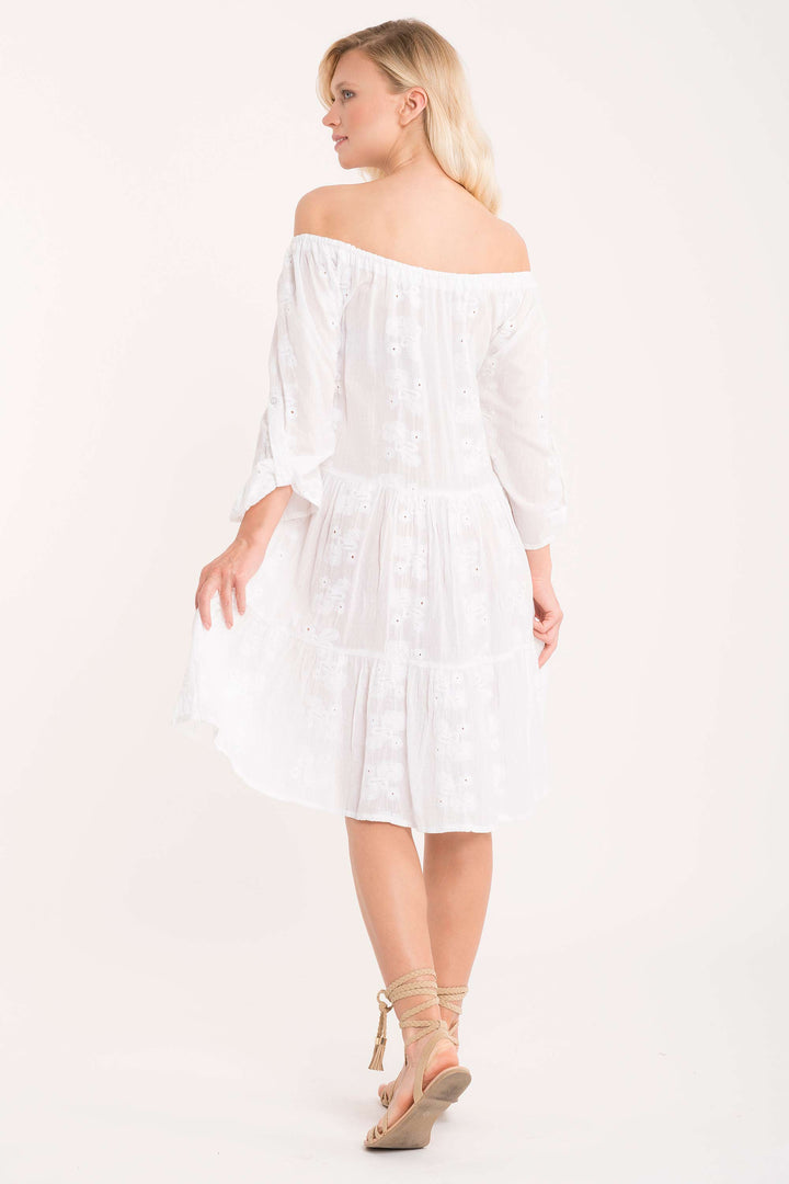 Dieses elegante Kleid aus reinem Baumwollstoff mit feinem Bootsausschnitt, veredelt durch Sangallo-Spitzen-Details, ist ein vielseitiges Kleidungsstück, das sich durch hochwertige Verarbeitung und Liebe zum Detail auszeichnet, perfekt für Anlässe, die diskrete und bewusste Eleganz erfordern.