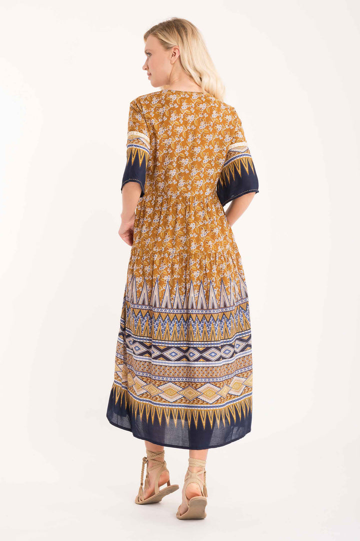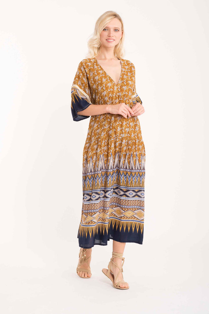 Dieses lange Kleid mit faszinierender ethnischer fantasie fängt die Essenz der handwerklichen Tradition ein. Das raffinierte Design kombiniert geometrische und kulturelle Muster und schafft ein vielseitiges Kleidungsstück, das ideal für besondere Anlässe und elegante Abende ist. Die fließende Silhouette garantiert Komfort und Bewegungsfreiheit, während die ethnischen Details Charakter und Persönlichkeit verleihen. Perfekt für alle, die ein einzigartiges Stück suchen, das zeitgenössischen Stil und bohemischen Charme vereint.