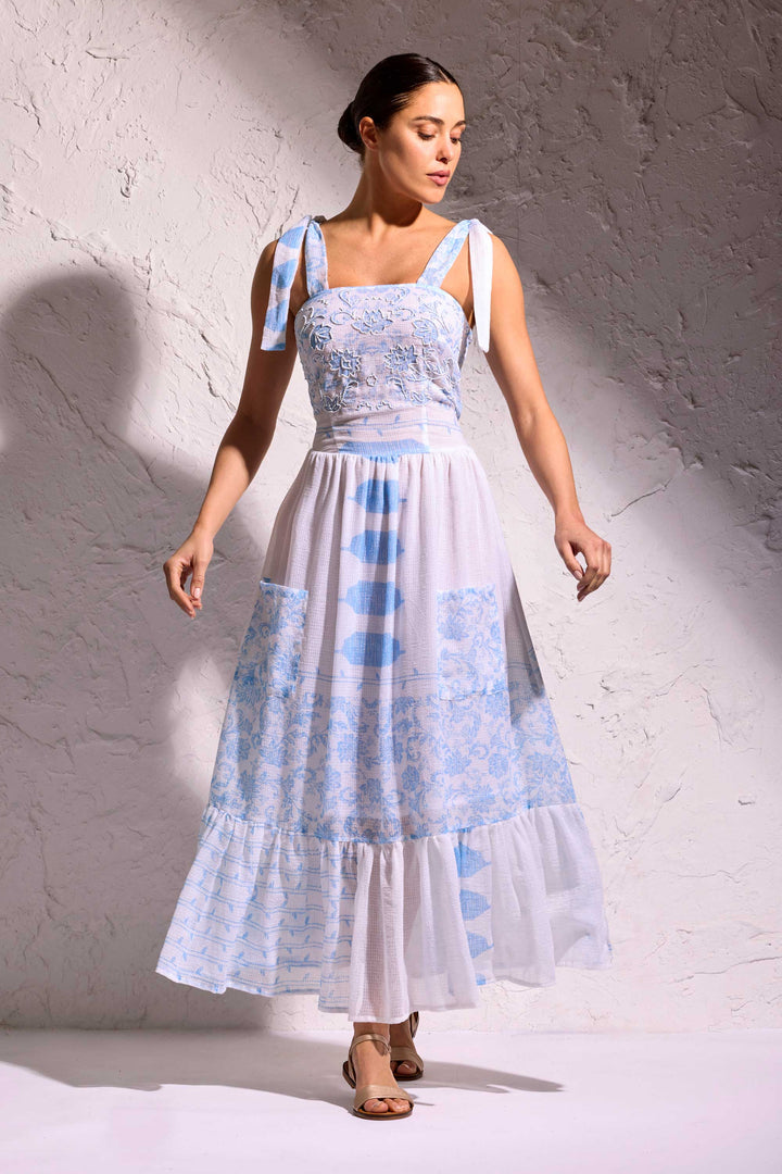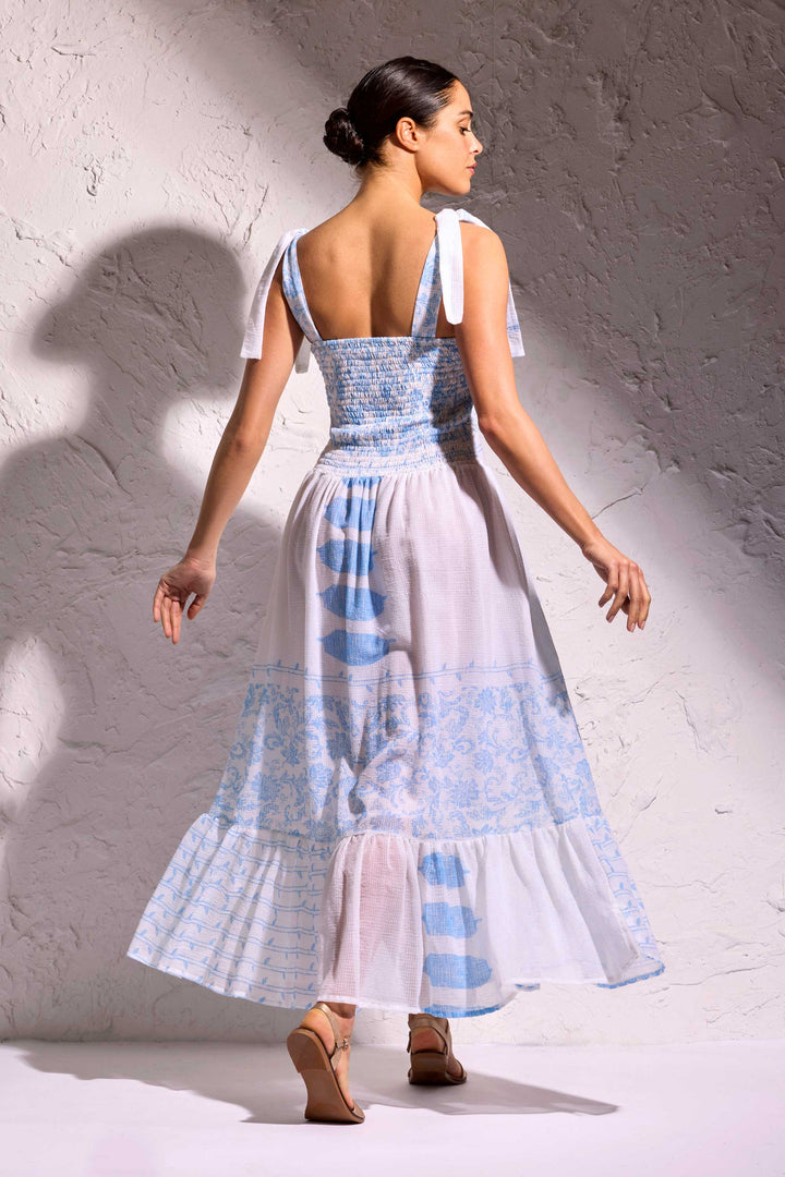 Entdecke das lange Kleid mit schulterpolster Nereidi aus reinem Baumwolle. Perfekt für frische und sommerliche Looks, macht das schlichte Design das Kleid vielseitig für jeden Anlass. Mit balzen am Rock und schulterpolster mit Knoten verleiht es deinem Stil einen Hauch von Frische und Vielseitigkeit.