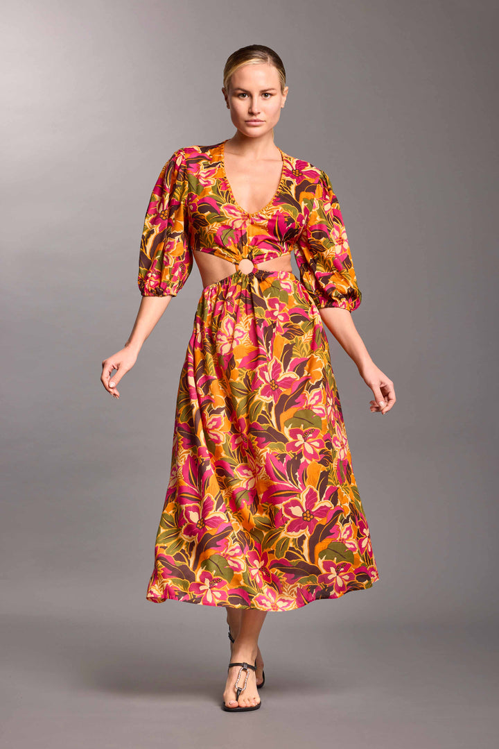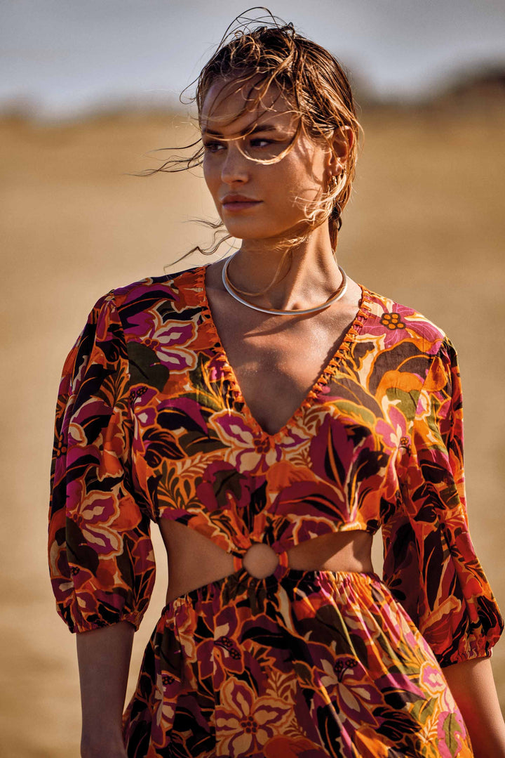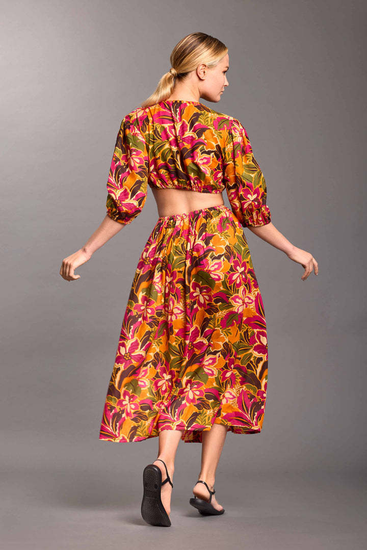 Las Esmeralda-Kleid aus Viskose verfügt über ein elegantes Cut-out-Detail, das die Silhouette betont. Der mehrfarbige tropische Druck macht es perfekt für einen modischen und frischen Look an heißen Sommertagen. Ideal für Veranstaltungen oder Sommerabende dank des leichten und atmungsaktiven Stoffes.