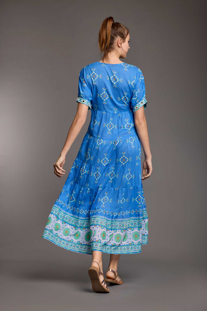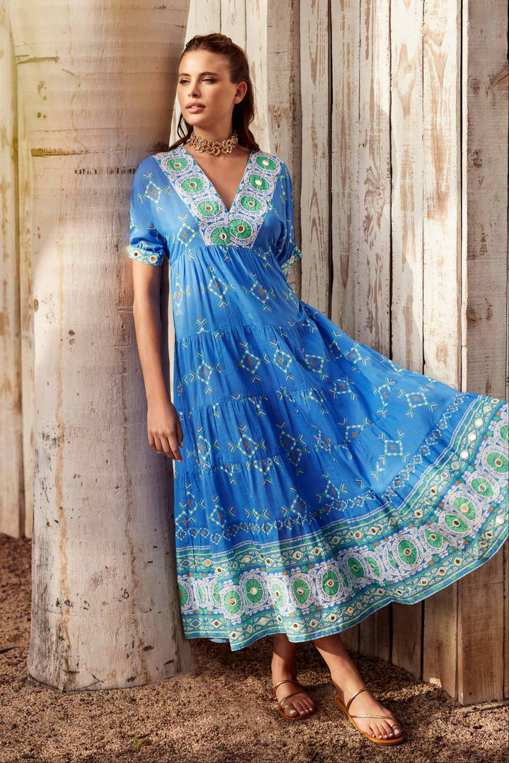 Das lange Kleid Ermione ist eine elegante Sommeroption für anspruchsvolle Looks oder lässige Chic-Events. Hergestellt aus reinem Baumwollstoff mit ethnischem Druck, bietet es ein fließendes und feminines Design mit einem balzen und kurzen Ärmeln. Erreiche maximalen Stil mit diesem einzigartigen Kleidungsstück.