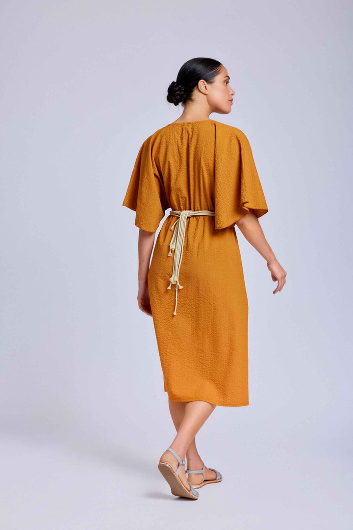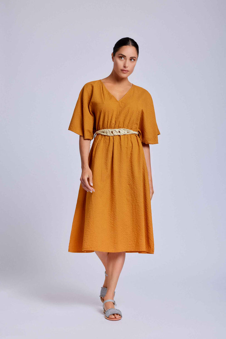 Dieses lange Kleid aus reiner Baumwolle vereint Komfort und Eleganz dank seines natürlichen, atmungsaktiven Materials. Der V-Ausschnitt schmeichelt der Figur, während der Gürtel die Taille betont und für einen taillierten Look sorgt. Perfekt für alle, die ein vielseitiges und elegantes Kleidungsstück für verschiedene Anlässe suchen.