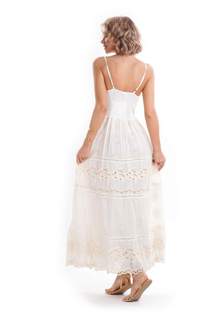 Dieses elegante lange Kleid aus reinem Baumwollstoff, veredelt mit zarten Details aus Sangallo-Spitze, stellt einen Hauch zeitloser Raffinesse dar. Die verstellbaren schulterpolster garantieren eine individuelle Passform für jede Silhouette und sorgen den ganzen Tag über für Komfort und Bewegungsfreiheit. Ein vielseitiges und anspruchsvolles Kleidungsstück, perfekt für besondere Anlässe oder für diejenigen, die Qualität und Stil in ihrer Sommerkollektion suchen.