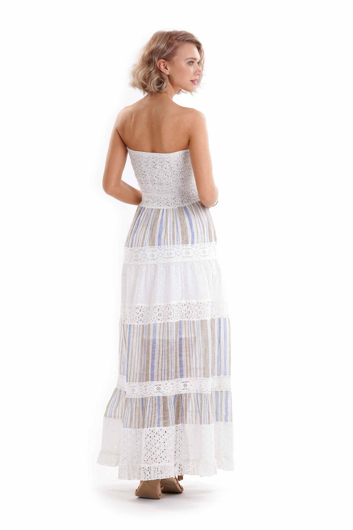 Dieses elegante lange Kleid aus reinem Leinen ist perfekt für Sommerabende an der Küste. Das Bandeau-Modell umschmeichelt sanft die Silhouette, während die Details aus Makramee- und Sangallo-Spitze Raffinesse und Bewegung hinzufügen. Die Kombination aus Naturstoff und handwerklicher Verarbeitung schafft ein vielseitiges Kleidungsstück, ideal für besondere Anlässe oder für diejenigen, die Komfort ohne stilistische Kompromisse suchen. Ein zeitloses Stück, das die Essenz der mediterranen Mode einfängt.