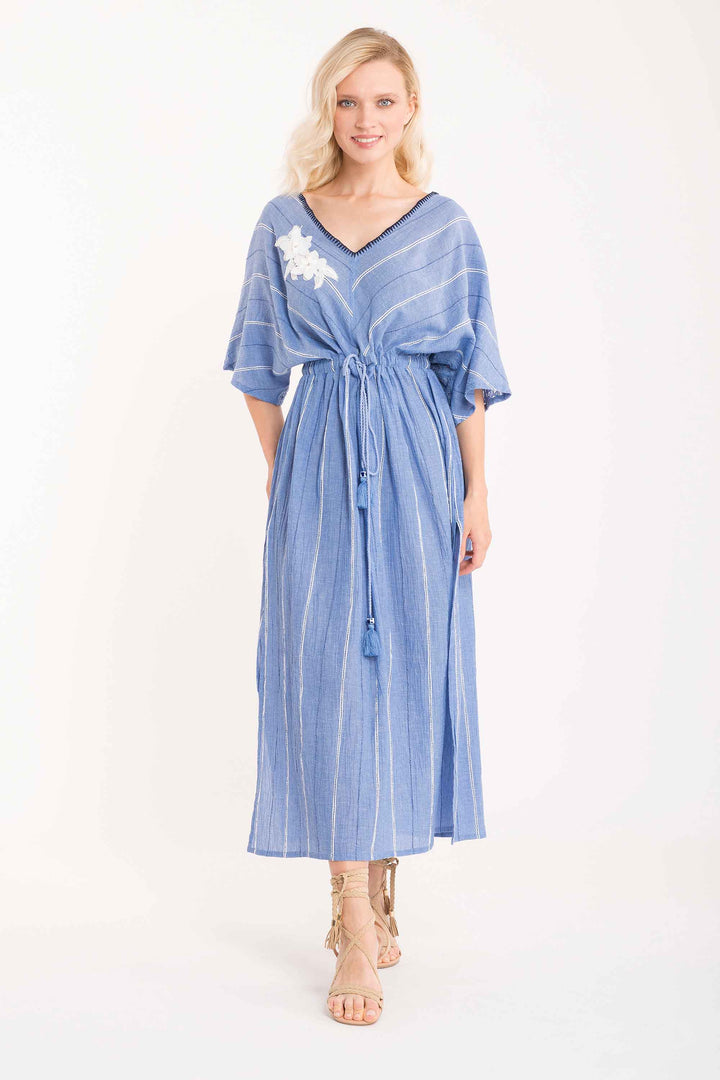 Dieses elegante lange Kleid aus reiner Baumwolle ist perfekt für sommerliche Tage am Meer. Die fließende und bequeme Silhouette wird durch einen verstellbaren Gummizug im leben ergänzt, der es ermöglicht, die Passform nach deinen Vorlieben anzupassen. Der Baumwollstoff sorgt für Weichheit auf der Haut, ideal für alle, die Qualität und Praktikabilität in der Sommergarderobe suchen.