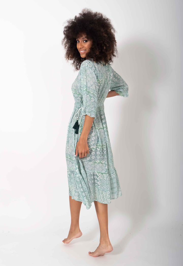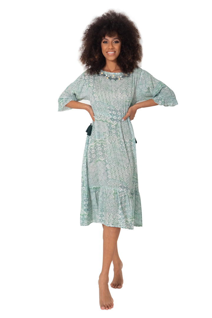 Dieses lange Kleid hat ein fantasia in mehreren Farben und ein handgesticktes Motiv, das es einzigartig und von hoher Qualität macht. Die ¾-Ärmel und der a balze verleihen ihm Eleganz und Weiblichkeit, während der runde Ausschnitt und die vita einen bequemen und perfekten Sitz für jeden Anlass gewährleisten.