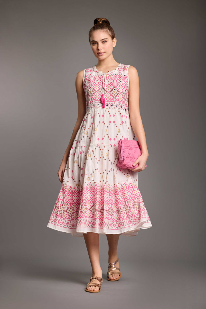 L'anges ärmelloses Kleid Denise aus reinem Baumwollstoff mit ethnischem Druck ist perfekt für die Sommertage. Das fließende Design bietet Komfort und Stil, während die Kordel mit Quasten am Hals einen ethnischen Akzent setzt. Hergestellt aus reiner Baumwolle, ist es ideal für lässige und frische Looks.