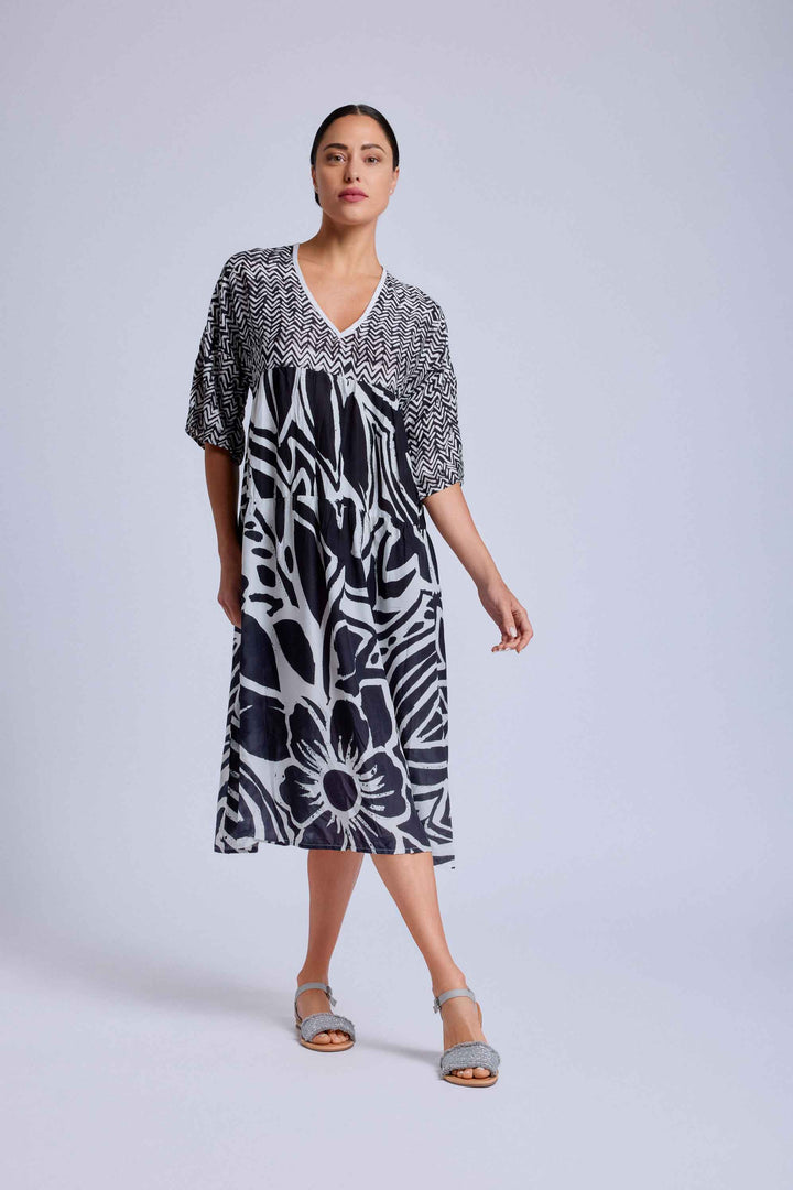 LANGES KLEID IN SCHWARZ-WEISS-TÖNEN