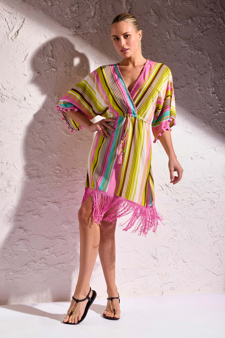 Kleid in fantasie Streifen mit weiten ¾-Ärmeln, die die Bewegung umrahmen. Der Rock hat Fransen, die elegant schwingen, während die mittlere Länge Vielseitigkeit für jeden Anlass garantiert. Perfekt für diejenigen, die ein Kleidungsstück suchen, das Komfort und zeitgenössischen Stil vereint, ideal zum Tragen vom Strand bis zum Sommerabendessen.