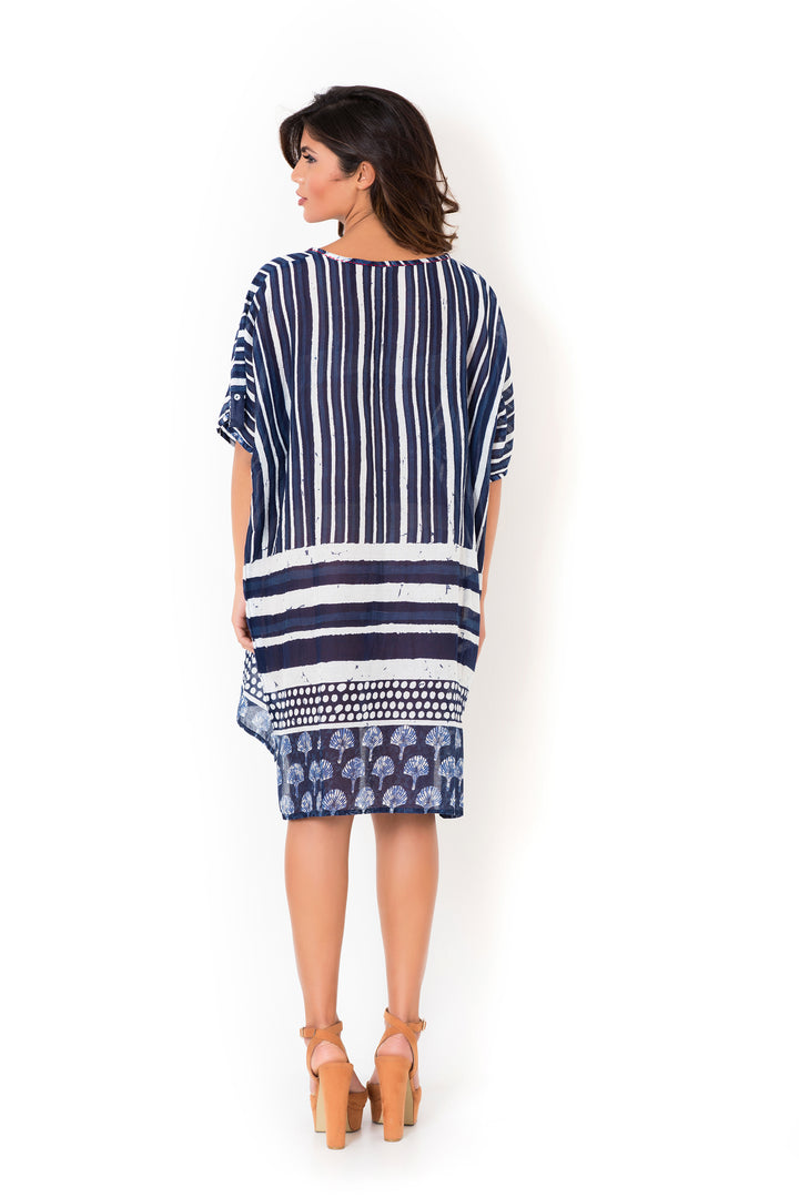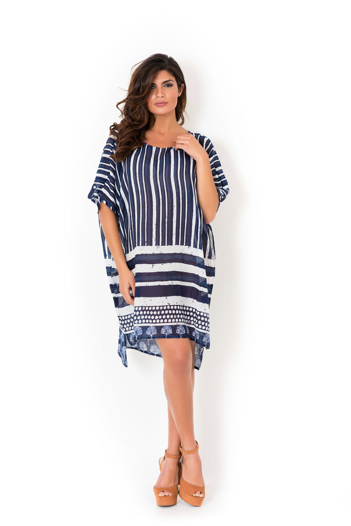 Dieses Kleid, aus reinem Baumwollstoff gefertigt, garantiert Atmungsaktivität und Komfort den ganzen Tag über. Das Muster in Blautönen bietet einen raffinierten, aber vielseitigen Look, perfekt sowohl für legere als auch elegantere Anlässe. Der natürliche Stoff und das raffinierte Design vereinen sich, um eine stilvolle und bequeme Wahl für deine Garderobe zu bieten.