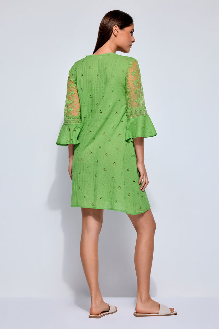 Dieses elegante Kleid aus hochwertiger Sangallo-Spitze aus reinem Baumwolle zeichnet sich durch ein fließendes und feminines Design aus. Die ¾-Ärmel und der V-Ausschnitt verleihen einen Hauch von Eleganz, während das gestickte Muster und die A-Linie einen raffinierten Look bieten. Perfekt für jeden Anlass.