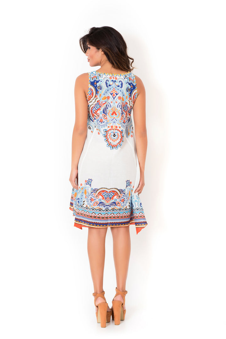 Das ärmellose Kleid Artemide aus reinem Baumwollstoff mit faszinierender ethnischer fantasie verbindet Komfort und Stil mit der natürlichen Qualität der Baumwolle und garantiert Atmungsaktivität und Weichheit auf der Haut. Ein vielseitiges Kleidungsstück, das sich für verschiedene Anlässe eignet, vom lässigen bis zum eleganteren Look, und dabei zeitlose Eleganz bewahrt.