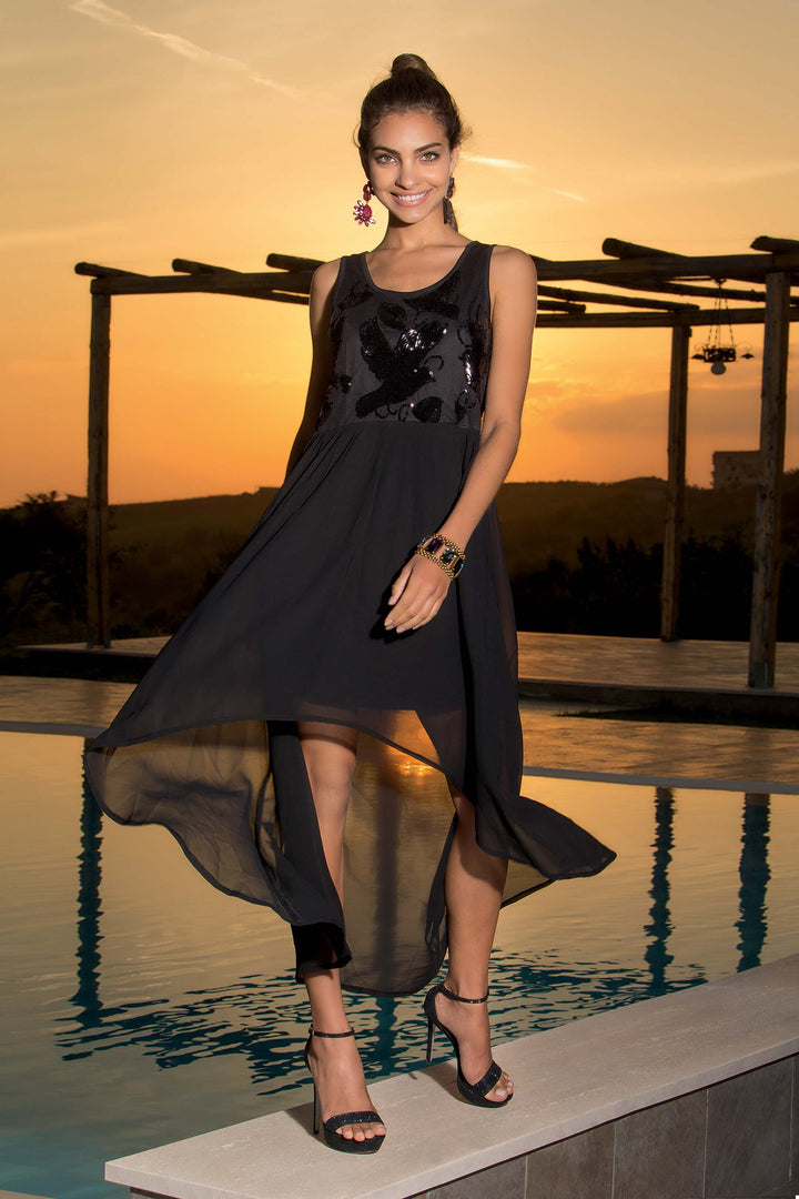Dieses ärmellose Kleid ist perfekt für besondere Anlässe. Es ist in einer eleganten Volltonfarbe gefertigt und verfügt über ein paillettenbesetztes Oberteil, das einen Hauch von Licht verleiht, und einen originellen, asymmetrischen, transparenten Rock. Mit einem runden Ausschnitt verleiht es einen modernen und raffinierten Look.