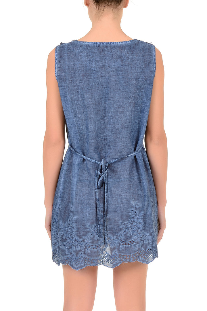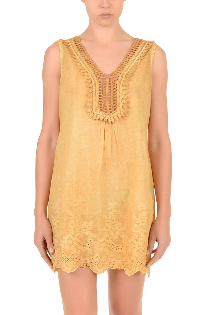 Dieses ärmellose Kleid aus reinem Baumwolle ist ideal für die Sommersaison. Der Stoff garantiert Atmungsaktivität und Komfort während der heißesten Tage und ermöglicht eine optimale Luftzirkulation. Die ärmellose Silhouette bietet Bewegungsfreiheit und stilistische Vielseitigkeit und passt perfekt zu lässigen und halbformellen Anlässen. Die Qualität der Baumwolle sorgt für Langlebigkeit und einfache Pflege. Ein unverzichtbares Kleidungsstück, das Praktikabilität und zeitlose Eleganz verbindet.