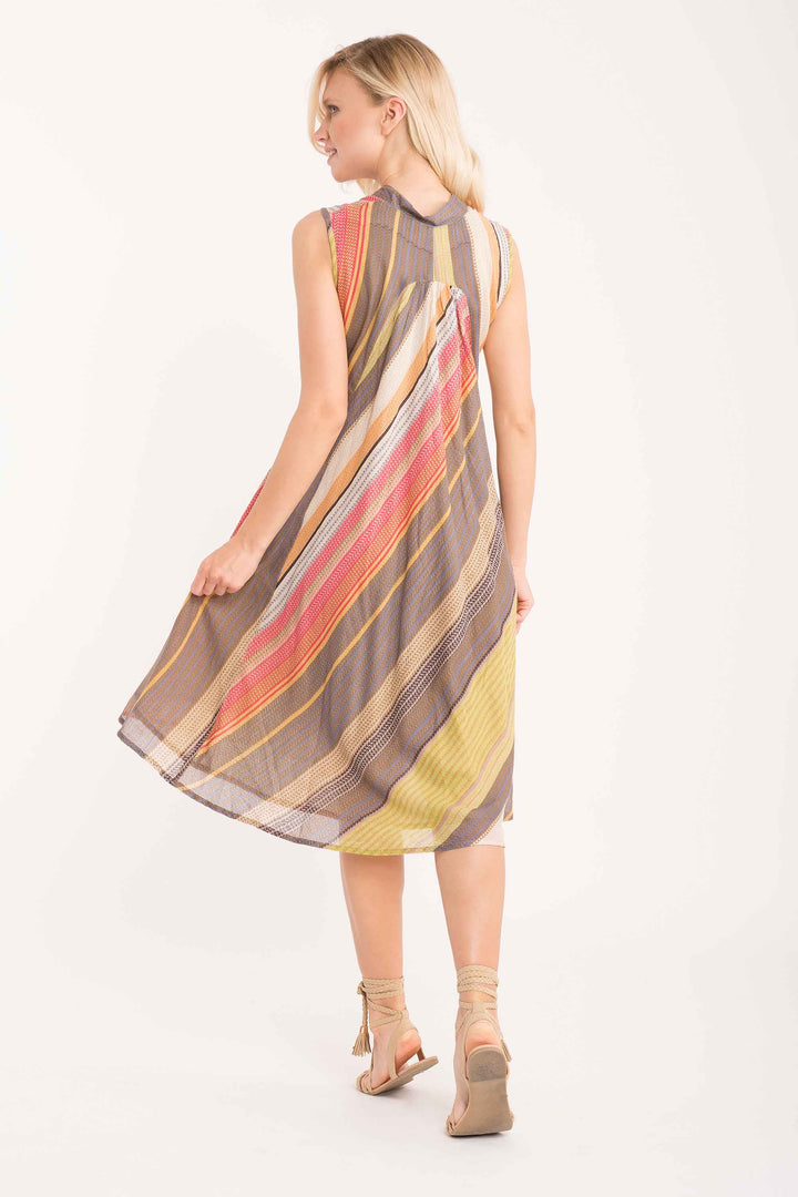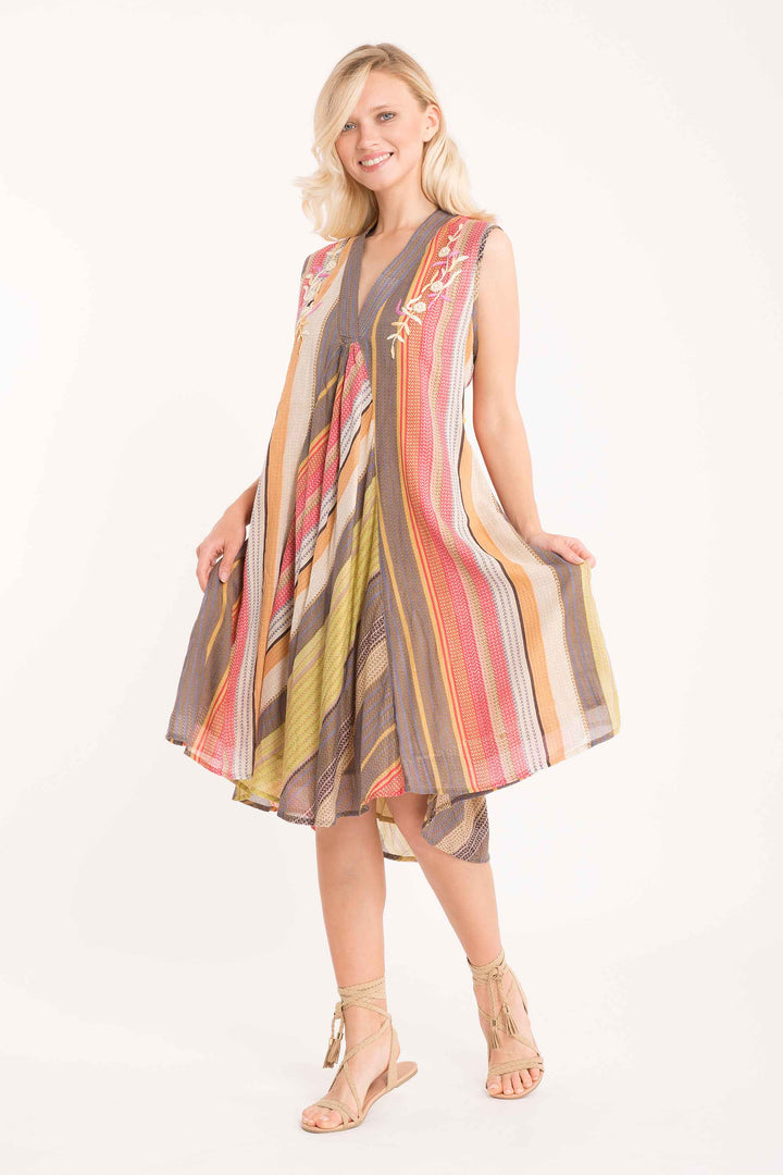 Das ärmellose Kleid Sofia aus reinem Baumwollstoff zeichnet sich durch eine fantasie in warmen Tönen aus, die dem Kleidungsstück Charakter und Vielseitigkeit verleiht. Der Baumwollstoff sorgt für Atmungsaktivität und Komfort während des Tages, während die ärmellose Silhouette Bewegungsfreiheit bietet. Ein unverzichtbares Kleidungsstück für die Sommergarderobe.