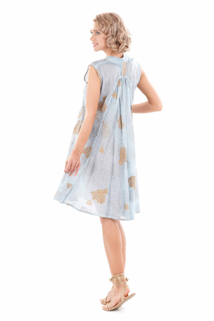 Raffiniertes ärmelloses Kleid aus hochwertiger reiner Baumwolle. Das Design verfügt über einen eleganten V-Ausschnitt, der die Figur streckt, während der exklusive Korallenprint die Meerestiefen des Mittelmeers heraufbeschwört. Verziert mit filigranen Paillettenstickereien, die das Licht bei jeder Bewegung einfangen, steht dieses Kleidungsstück für exzellente Handwerkskunst und verbindet Komfort mit Raffinesse für anspruchsvolle Sommeranlässe.