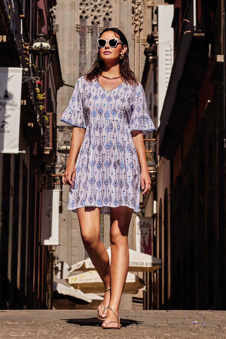 L'Abito Syros ist perfekt für den Sommer dank seines ethnischen Drucks und der kurzen Ärmel mit balzen. Hergestellt aus frischem, atmungsaktivem Baumwollstoff, garantiert es maximalen Komfort an heißen Tagen und bei Outdoor-Veranstaltungen. Das vielseitige Design macht es ideal für jeden Anlass.
