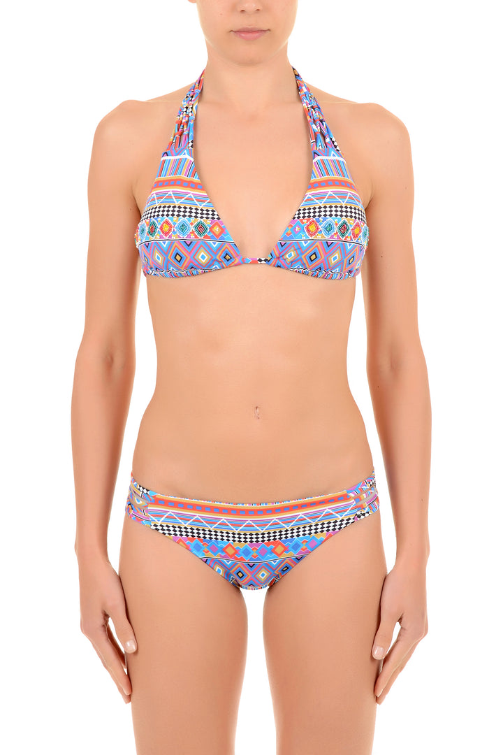 Dieser Bikini besteht aus einem Triangel-Oberteil und einer klassischen Hose und bietet zeitlosen Stil und Komfort. Der farbenfroh gemusterte Stoff verleiht ihm eine frische und elegante Note – perfekt für einen selbstbewussten Look am Strand oder Pool. Dieses Set schmeichelt der natürlichen Figur und vereint Schlichtheit und Charme – ein vielseitiges Sommer-Essential.