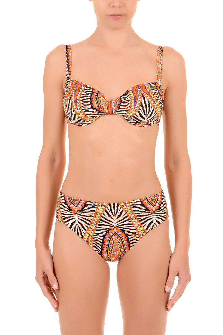 Dieser Bikini mit verfügbaren Cups in C, D und E bietet angemessenen Halt und eine perfekte Passform für verschiedene Bedürfnisse. Die verstellbaren schulterpolster ermöglichen individuellen Komfort, während der klassische Slip eine elegante und kompromisslose Linie garantiert. Die ethnische fantasie verleiht einen unverwechselbaren und raffinierten Touch, ideal für alle, die am Strand einen originellen und hochwertigen Look wünschen.