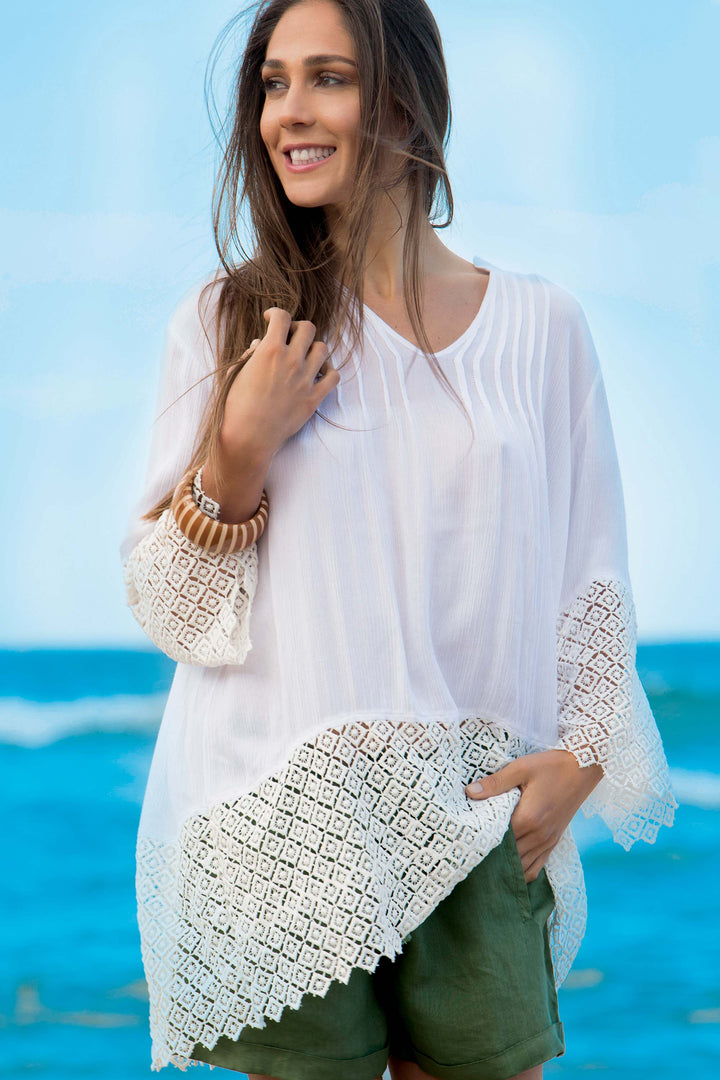 Diese Baumwollbluse garantiert Atmungsaktivität und natürlichen Komfort. Die Spitzendetails an Ärmeln und Saum verleihen einen raffinierten und femininen Touch, ideal für alle, die dezente Eleganz suchen. Die weiße Farbe macht sie vielseitig und leicht kombinierbar mit verschiedenen Looks, vom Casual- bis zum formellen Stil.