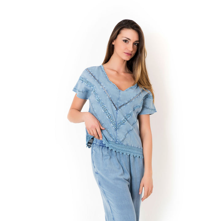 BLUSE MIT V-AUSSCHNITT E STICKEREIEN