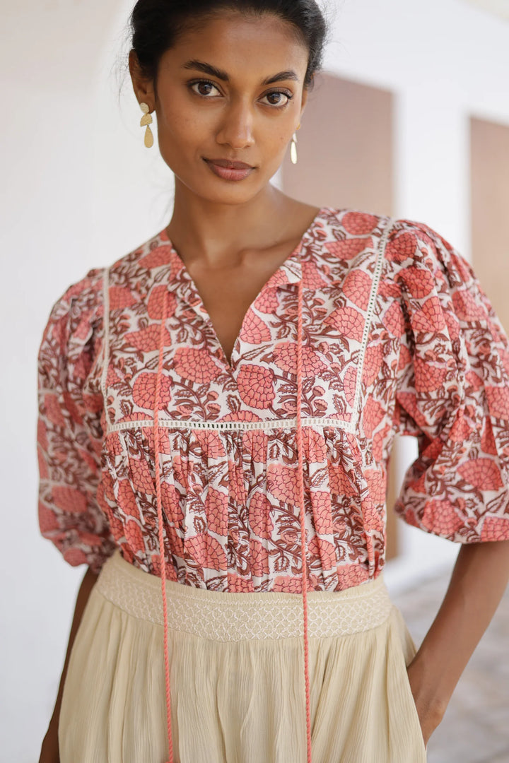 Die Bluse aus reinem Baumwolle ist ideal für einen eleganten, aber informellen Look. Der runde Ausschnitt mit Bändern verleiht einen Hauch von Originalität, während die Puffärmel viel Bewegungsfreiheit bieten. Die rosa Details auf der fantasie machen sie einzigartig und modern.