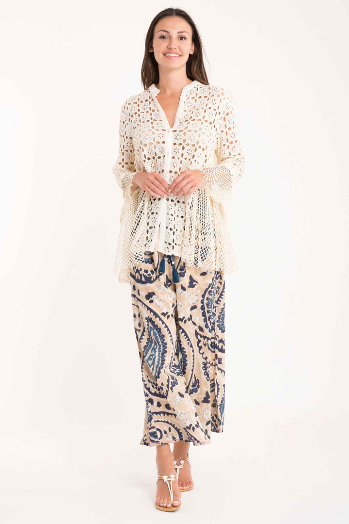 Diese Bluse aus reinem Baumwollstoff mit eleganten Sangallo-Spitzen-Details hat eine leichte und atmungsaktive Struktur. Der Verschluss mit Knopfleiste vorne sorgt für eine praktische und vielseitige Passform. Ein unverzichtbares Kleidungsstück, das Einfachheit und Stil kombiniert, perfekt, um sowohl für legere als auch formellere Anlässe raffinierte Looks zu kreieren.