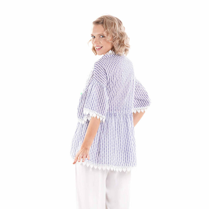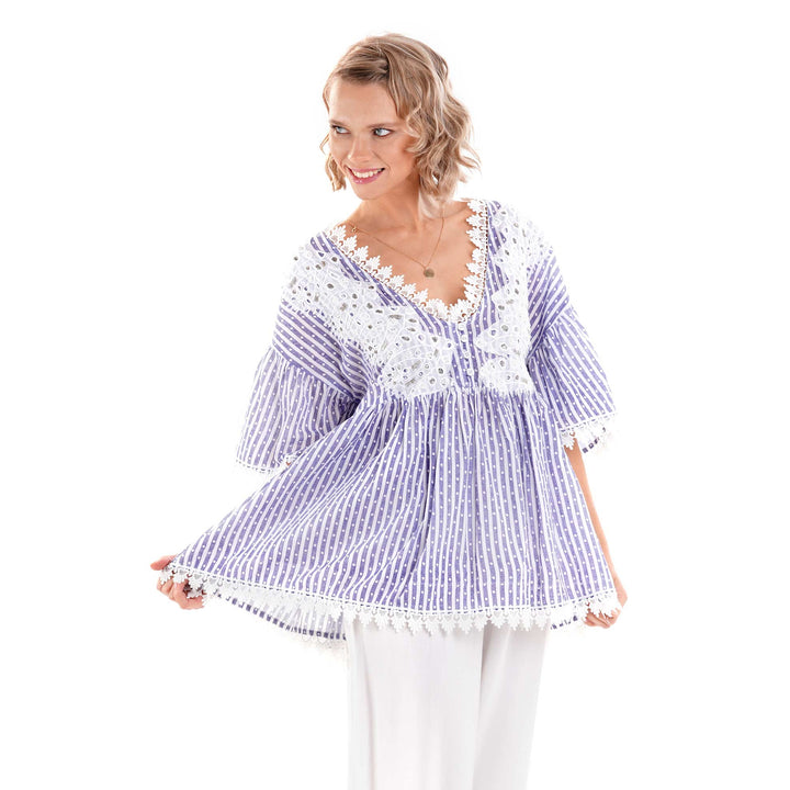 Diese Bluse aus reinem Baumwollstoff mit faszinierendem Spiel aus Streifen und Punkten fängt den Geist der italienischen Küstenmode ein. Der V-Ausschnitt betont die Eleganz der Silhouette, während die zarte aufgenähte Sangallo-Spitze einen Hauch handwerklicher Raffinesse verleiht. Ein vielseitiges Kleidungsstück, das Komfort und Stil vereint, perfekt für alle, die Qualitätsdetails und schlichte Raffinesse schätzen.
