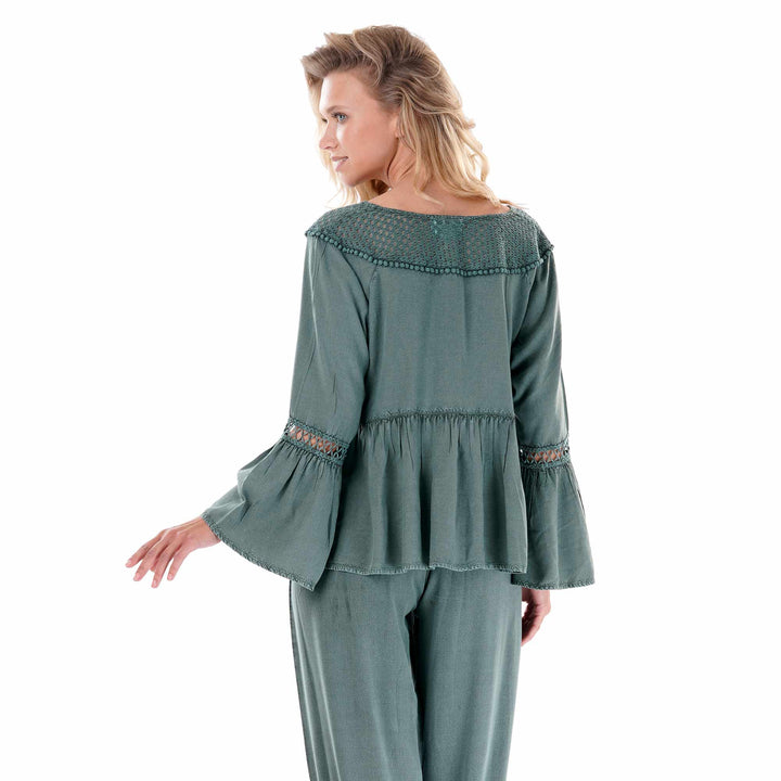Die Bluse Lilian vereint Komfort und Stil dank ihres bequemen Schnitts und des leichten Stoffes, ideal für wärmere Tage. Die Einsätze aus geflochtenen Stickereien verleihen einen raffinierten und handwerklichen Touch, der jedes Detail hervorhebt. Perfekt für alle, die ein vielseitiges und hochwertiges Kleidungsstück suchen, das sowohl lässige als auch gepflegte Looks elegant begleitet.