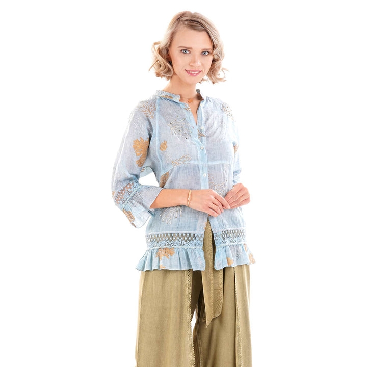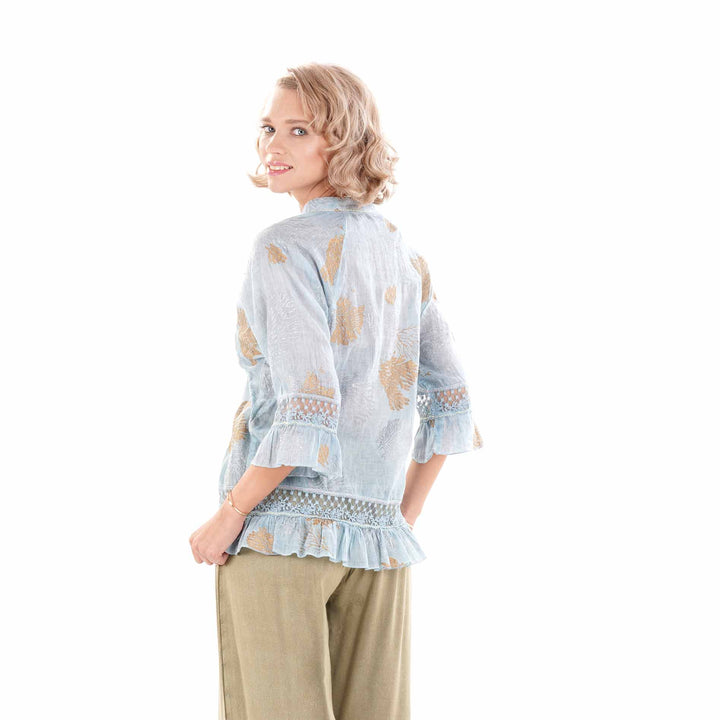 Diese Bluse aus reinem Baumwollstoff mit durchgehender Knopfleiste und raffinierter balzen am Saum ist ein unverzichtbares Kleidungsstück, das Einfachheit und Eleganz vereint. Die sorgfältigen Details verleihen einen Hauch von Raffinesse. Ideal für vielseitige Kombinationen, vom lässigen bis zum eleganteren Stil.