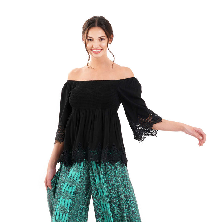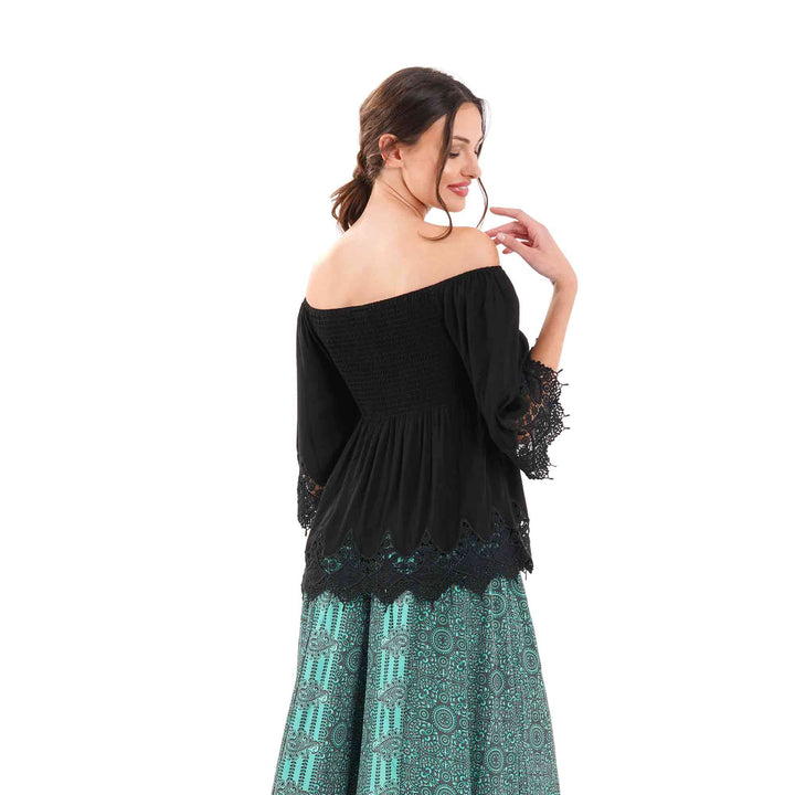 Diese elegante Bluse mit Bootsausschnitt umrahmt sanft die Schultern, perfekt für einen raffinierten und vielseitigen Look. Der elastische Bund sorgt für eine bequeme und enganliegende Passform, während die Spitzenstickereien einen Hauch von Raffinesse und Weiblichkeit hinzufügen. Ein ideales Kleidungsstück für alle, die Qualität und Stil ohne Kompromisse suchen, leicht kombinierbar mit Ihren Lieblingsstücken aus der Kollektion.