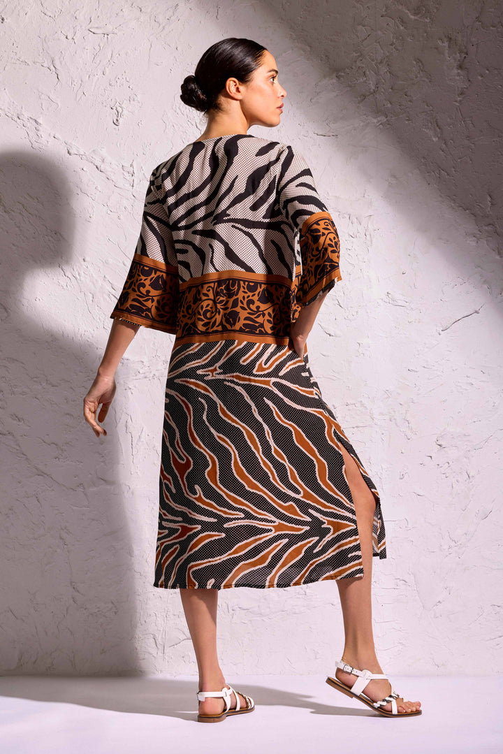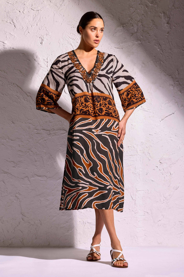 Der Camelia Kaftan aus Viskose ist das perfekte Kleidungsstück für deine Sommertage. Dank seines weiten Schnitts und des leichten Stoffes ermöglicht er es dir, in jeder Gelegenheit vielseitig und modisch zu sein, besonders im Urlaub. Mit seinem Animal-Print und dem V-Ausschnitt bist du immer modisch und bequem dank der 3/4-Ärmel.