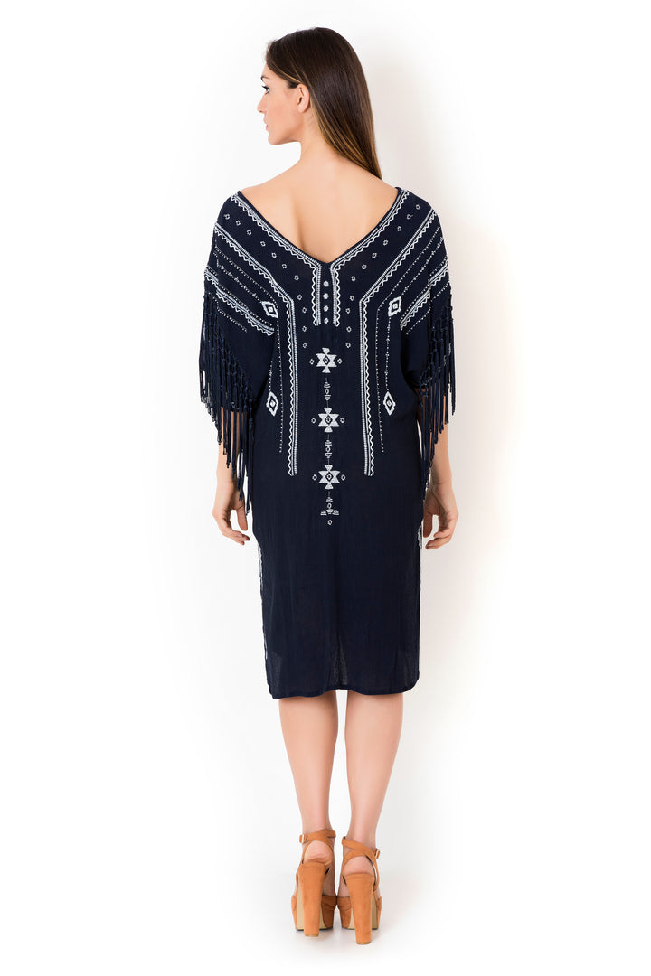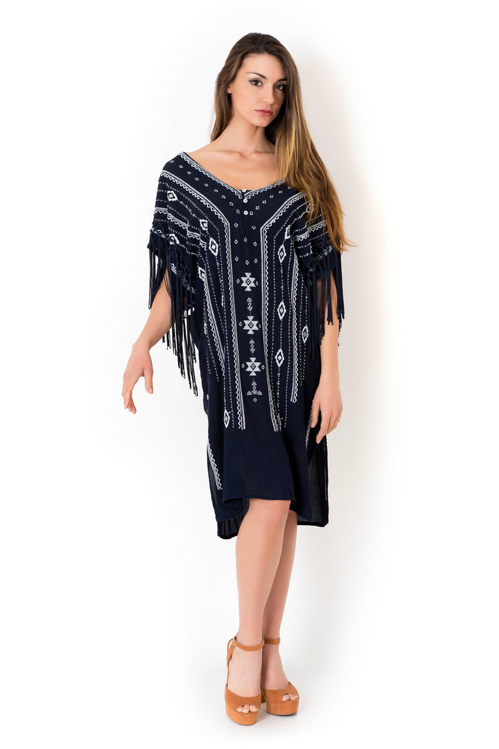 Dieser elegante Kaftan verfügt über einen V-Ausschnitt, der die Figur betont, und zarte Fransen-Details an den Ärmeln, die eine subtile Bewegung und Textur hinzufügen. Hergestellt aus atmungsaktivem Baumwollstoff, bietet er Komfort und bewahrt gleichzeitig ein raffiniertes Aussehen. Die seitlichen Schlitze erleichtern die Passform und tragen zur harmonischen Silhouette bei, was ihn zu einer idealen Wahl für sommerliche Anlässe oder stilvolle, legere Ausflüge macht.