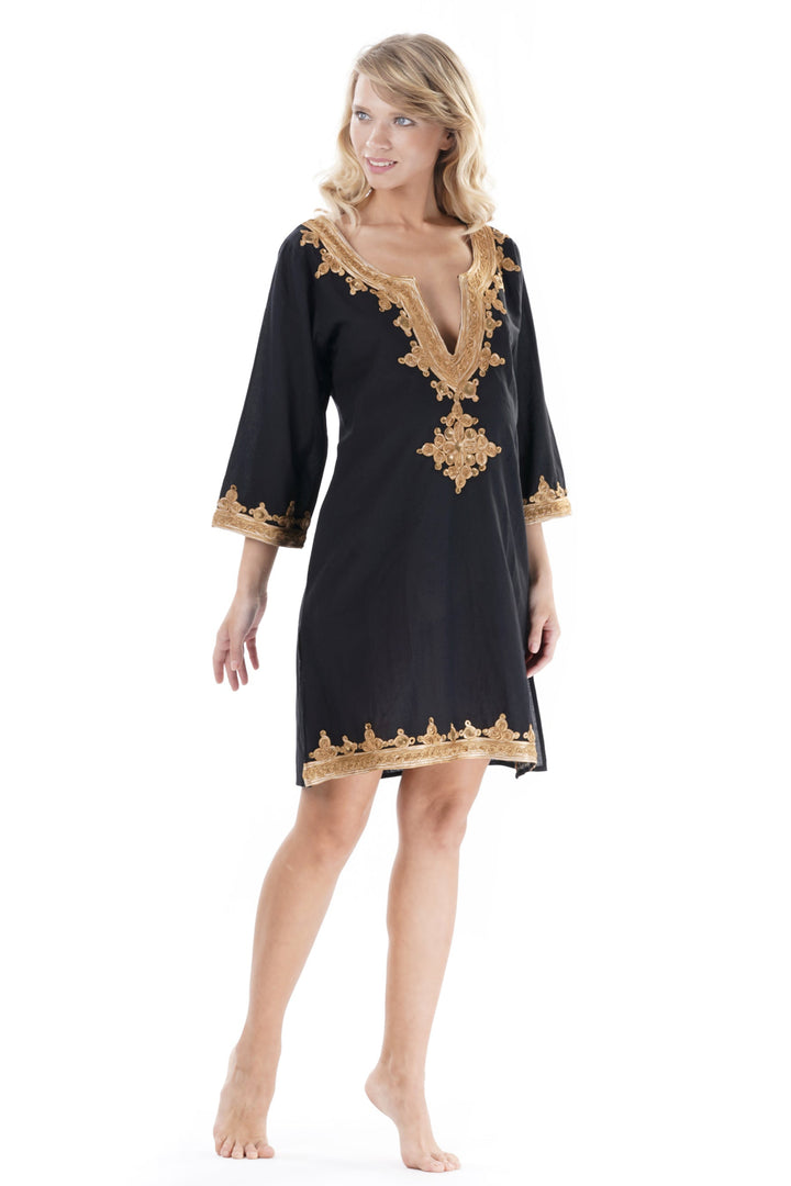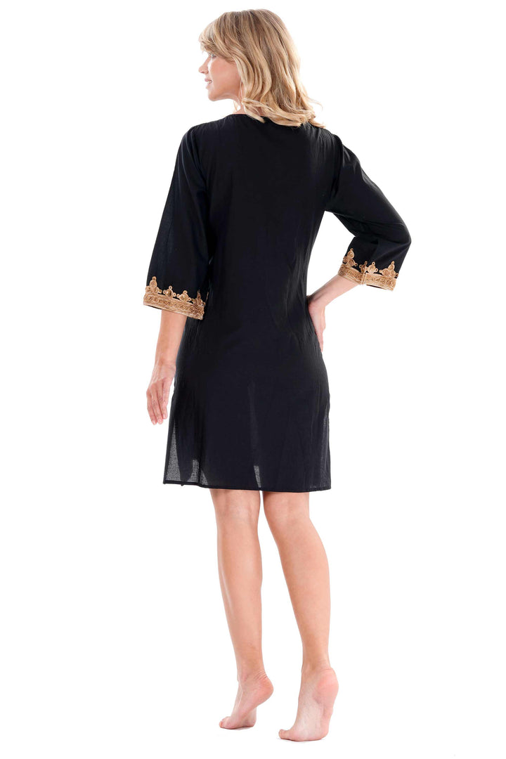 Eleganter Kaftan, der durch feine goldene Stickereien besticht, die jedes Detail hervorheben. Die seitlichen Schlitze sorgen für Komfort und Bewegungsfreiheit, wodurch dieses Kleidungsstück ideal für anspruchsvolle Anlässe oder entspannte Momente mit Stil ist. Sorgfältig gefertigt für zeitlose Eleganz.