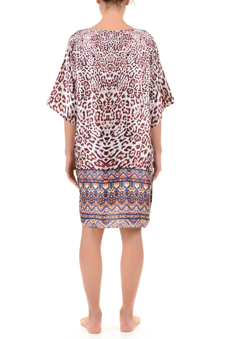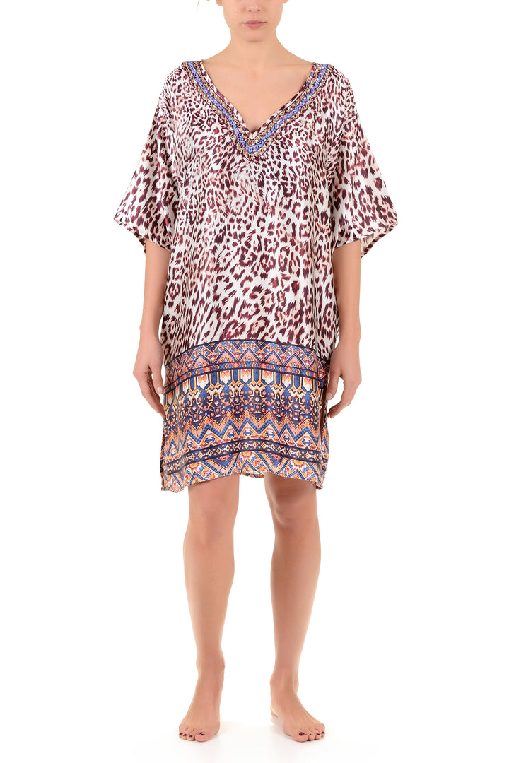 Dieser Kaftan verfügt über einen raffinierten V-Ausschnitt und ein elegantes Animalier-Muster, das Komfort mit einem kühnen und anspruchsvollen Stil verbindet. Ideal für alle, die einen modischen, aber entspannten Look suchen, verleiht er deiner Garderobe einen Hauch exotischen Charmes und bietet gleichzeitig eine einfache und bequeme Passform.