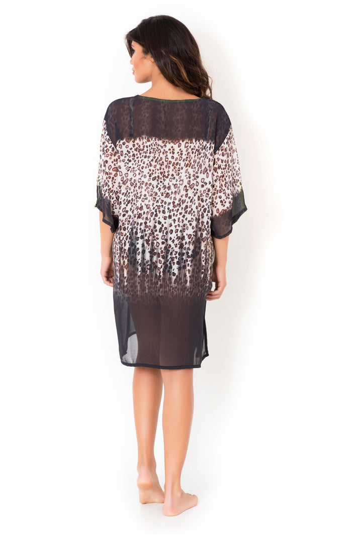 Dieser Kaftan mit Animal-Print hat einen V-Ausschnitt, der die Figur betont, und seitliche Schlitze für mehr Bewegungsfreiheit und eine luftige Silhouette. Der leichte Stoff fällt elegant und macht ihn zu einer raffinierten Wahl für einen modischen Strandlook oder entspannte Sommerausflüge.
